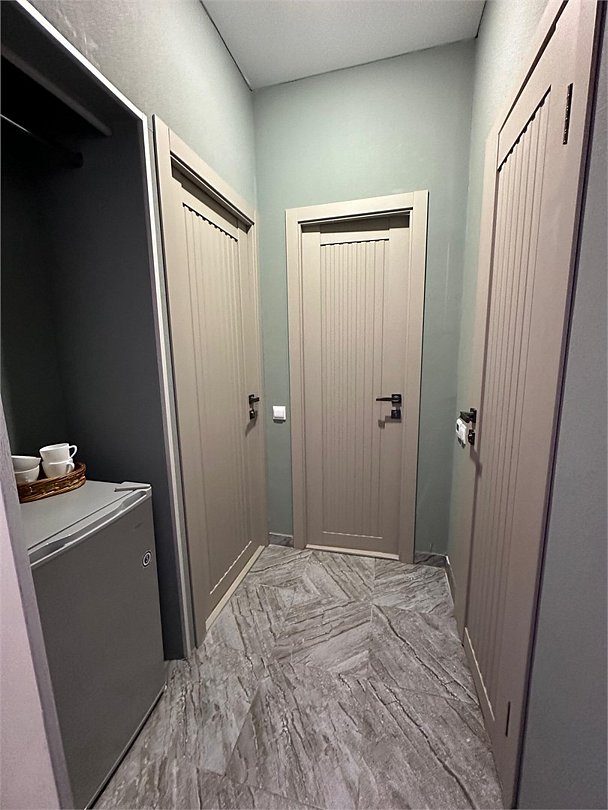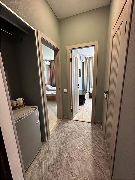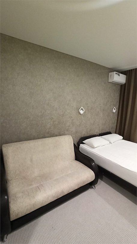 В номере: двуспальная кровать, раскладывающийся диван, кондиционер, холодильник, чайник, комплект посуды.