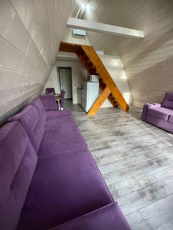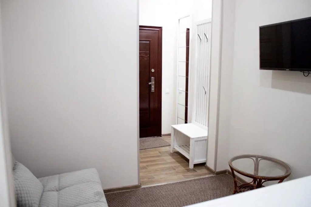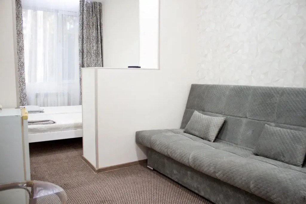2 комната - раскладывающийся диван, журнальный стол, холодильник, чайник, комплект посуды.