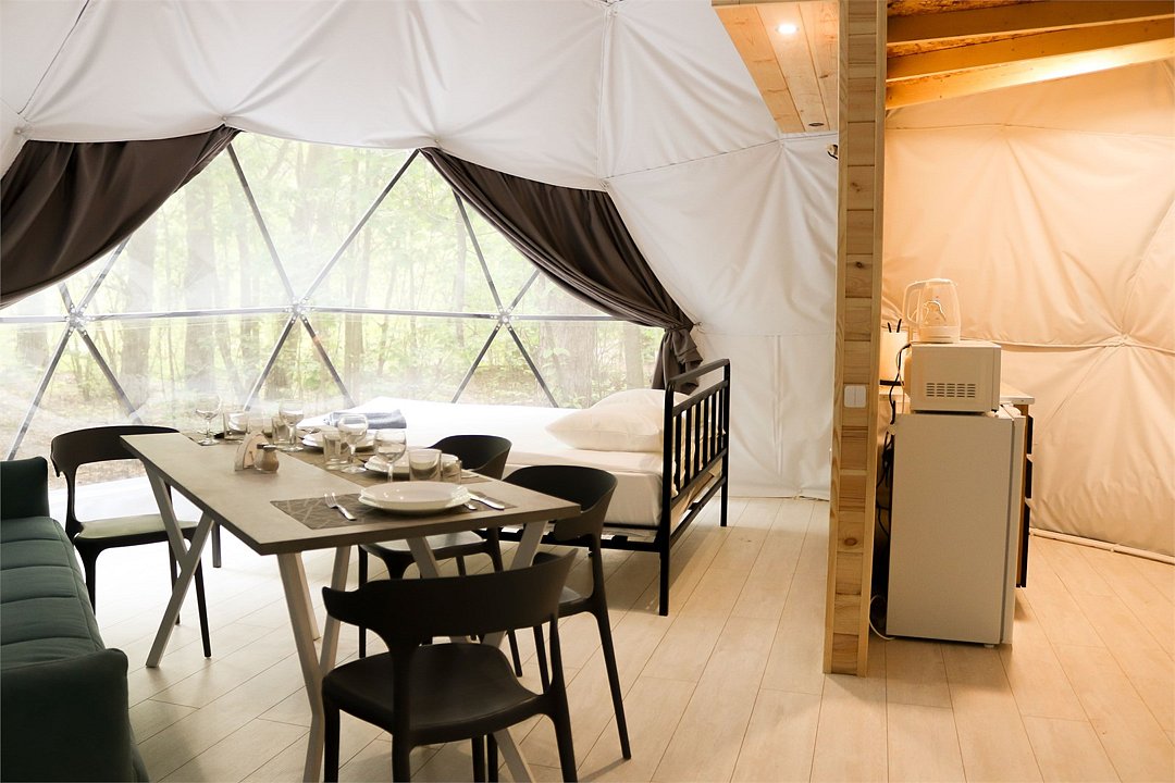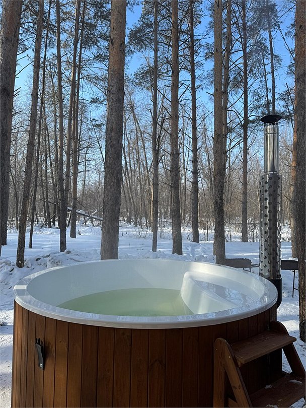 Баня-бочка из сибирского кедра на дровах вмещает до шестнадцати человек, в которой можно хорошо попариться. Для тех, кто любит шашлык, есть крытая веранда для барбекю, где можно приготовить вкусные блюда на открытом огне и насладиться отдыхом на свежем воздухе, независимо от погодных условий.