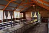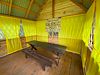 Беседка рассчитана на одновременное пребывание до двадцати человек. Внутри есть стол, стулья, холодильник и кухонная зона с раковиной. В холодное время года помещение можно обогреть печкой, что создает комфортные условия.