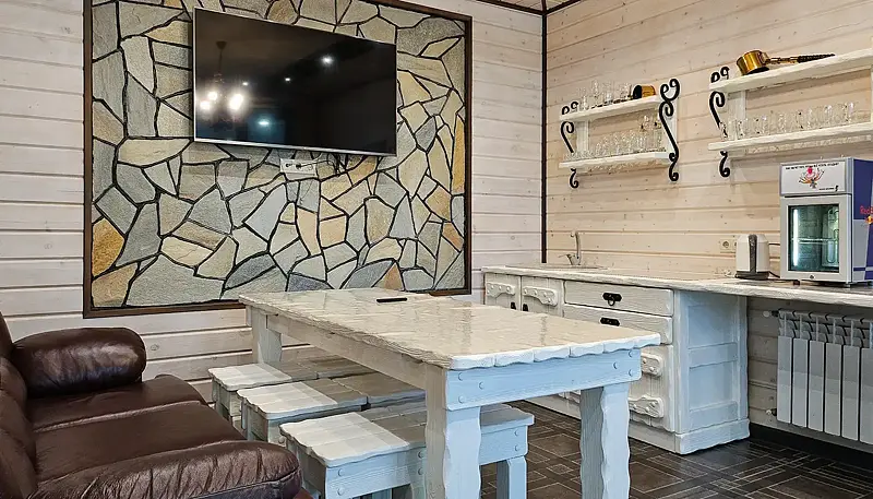 - банкетный зал: стол на 6-8 человек, телевизор, кухня, посуда;