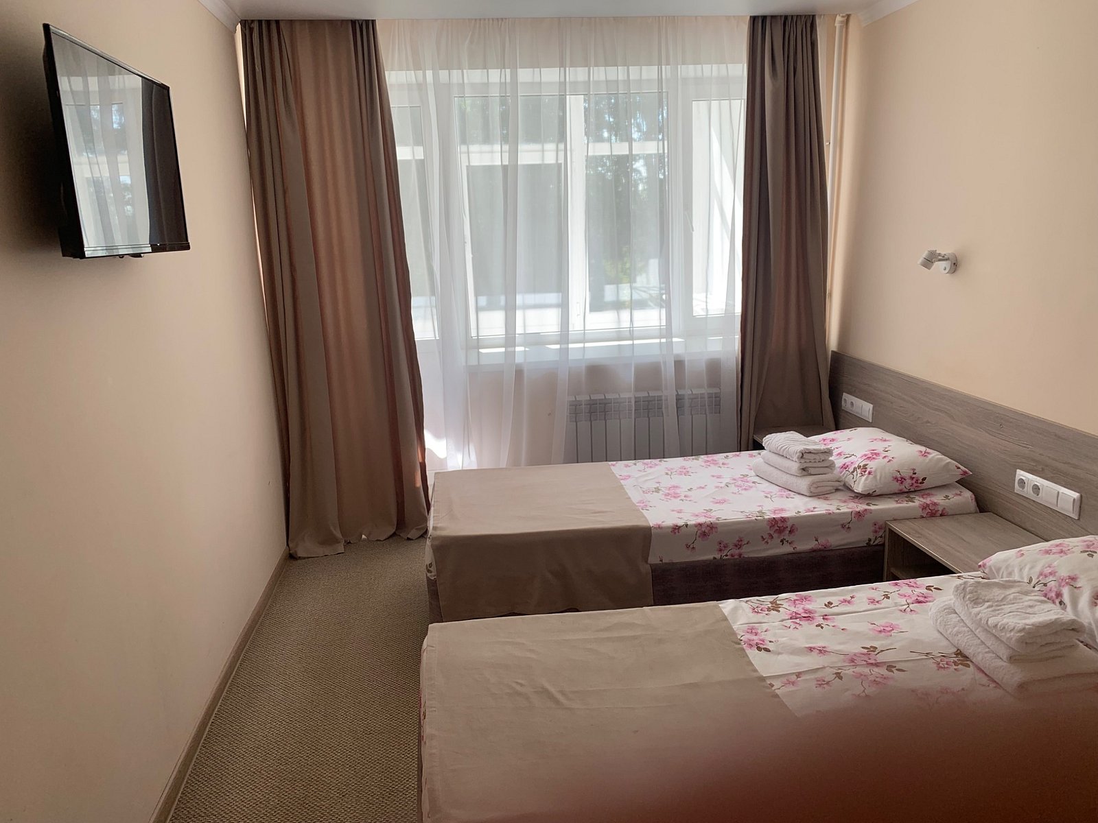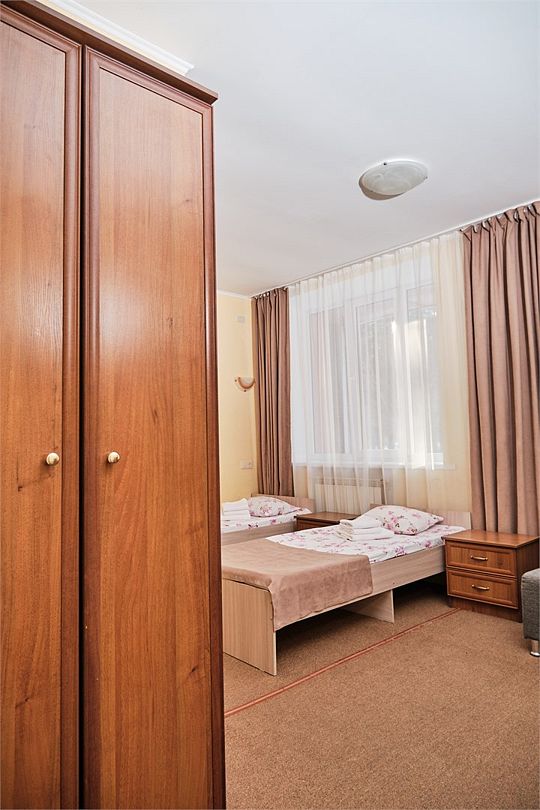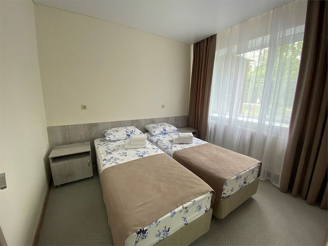 Номер с двумя кроватями размером 90*200 ( или двумя кроватями спринг-бокс размером 80х200) и всеми удобствами.
