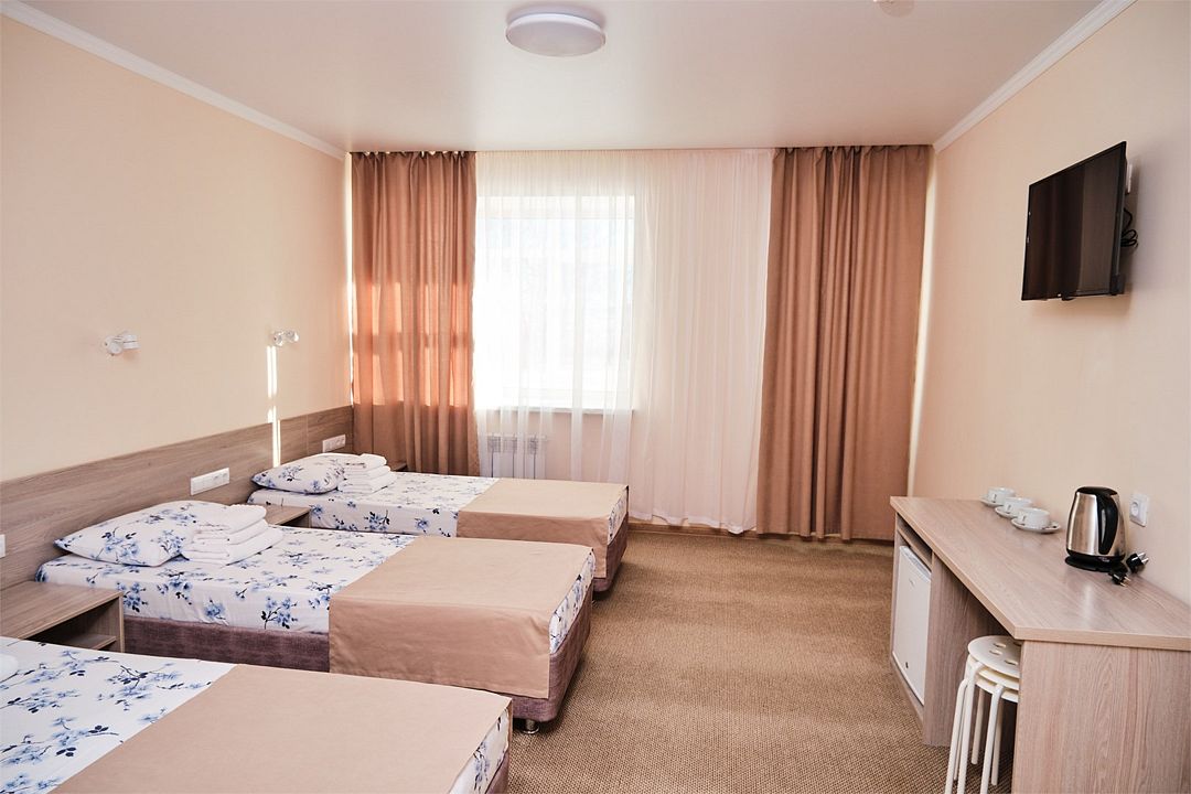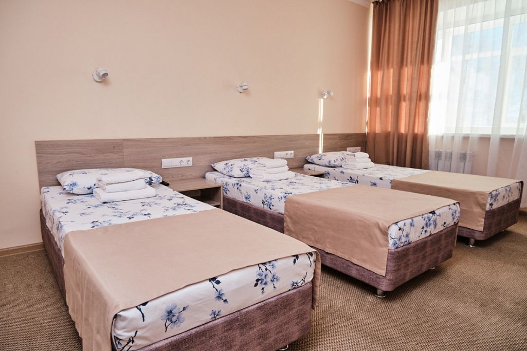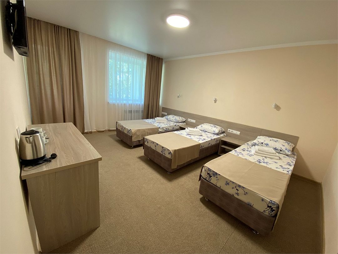 Номер с тремя кроватями размером 80х200 и всеми удобствами.