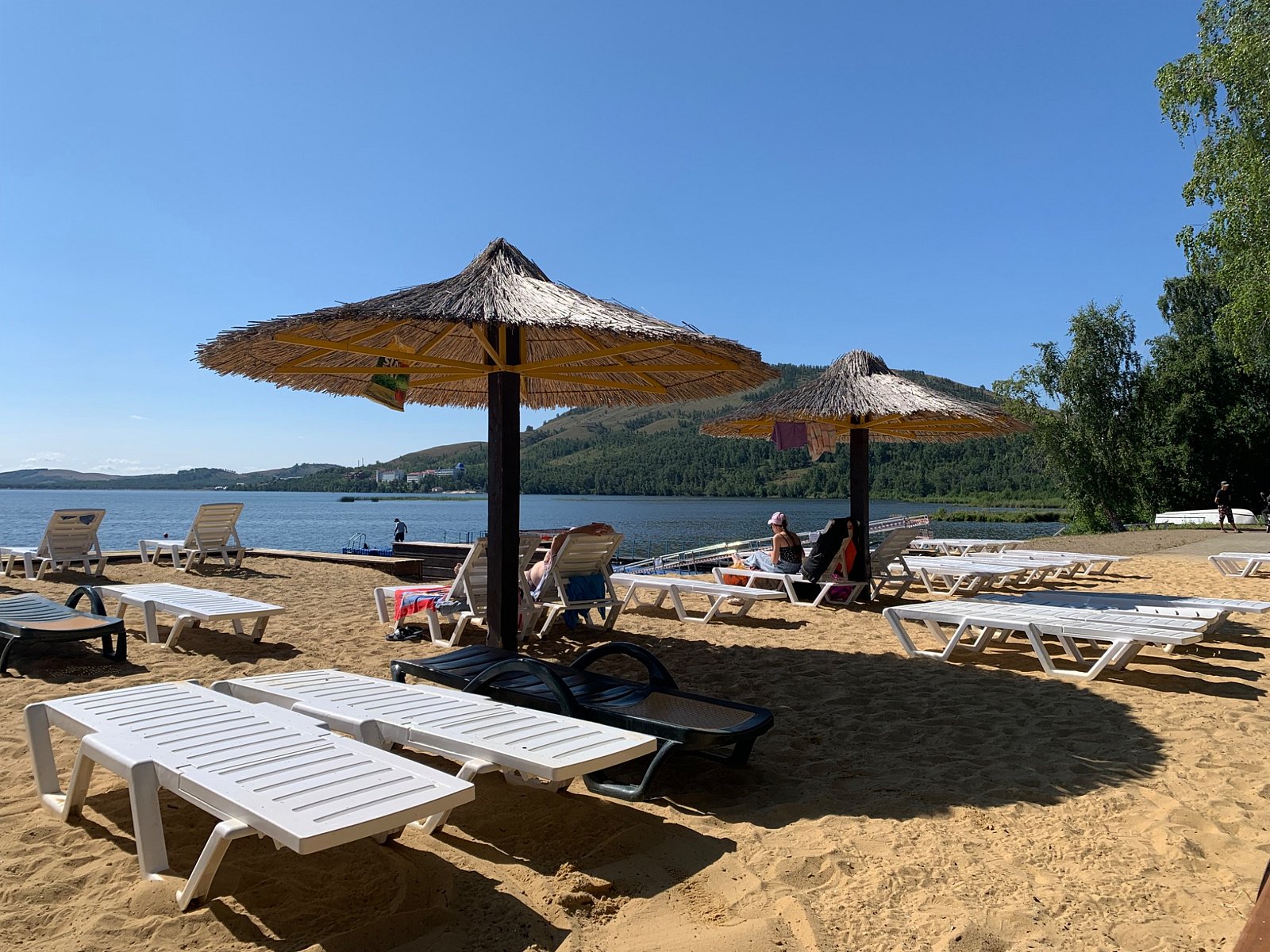 Тип пляжа: собственныйСобственный пляж протяженностью около 200 метров. Берег – мелкая и средняя галька, летнее кафе на пляже, площадка для пляжного волейбола, шезлонги, кафе «Таверна».