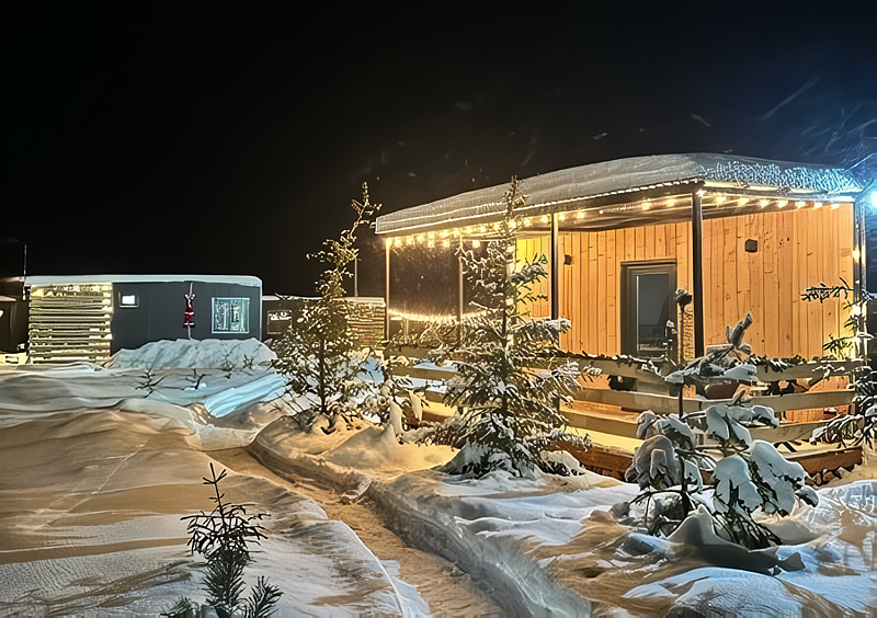 На территории расположены два дома на четырёх человек (белый и черный), один дом на двоих (малый) и сафари тент. А также баня, чан, костровая зона и собственный пирс с шезлонгами и креслами для отдыха. Каждый дом располагает собственной крытой террасой с уличной мебелью и качелями (15 м2) и мангальной зоной.