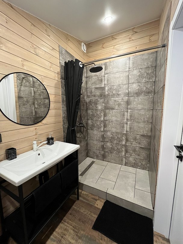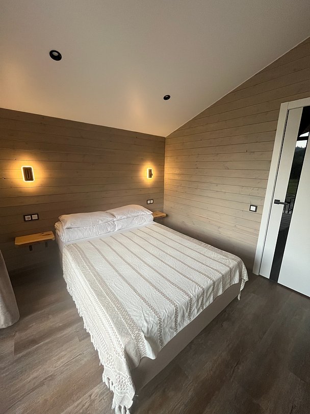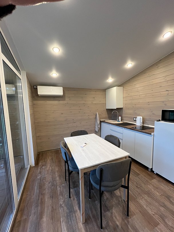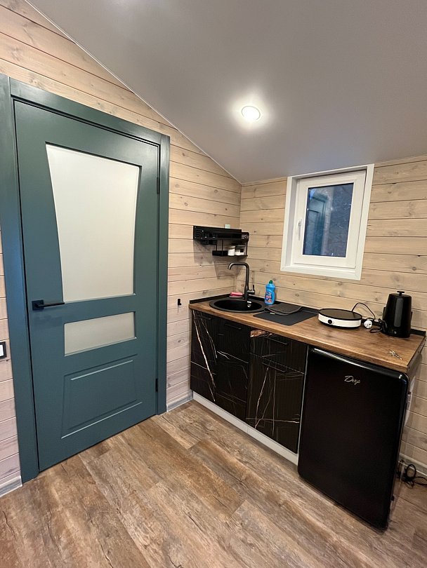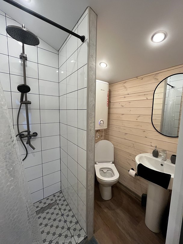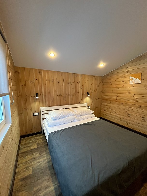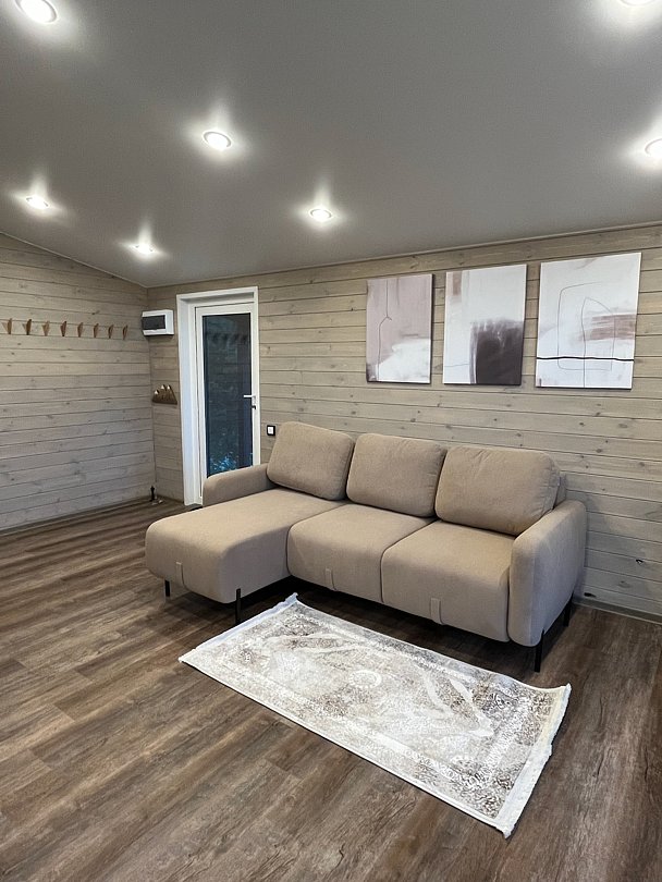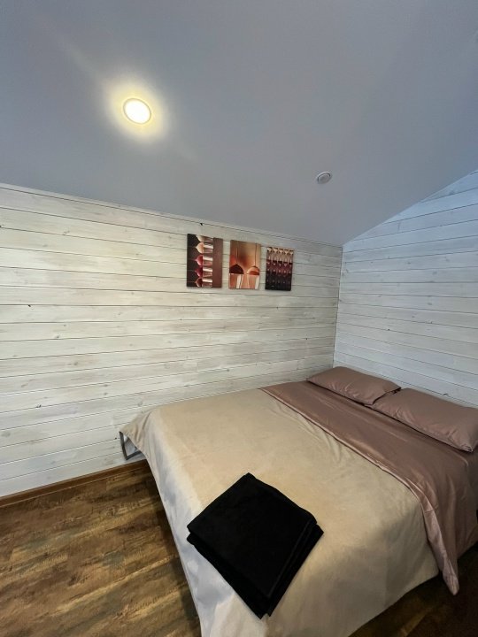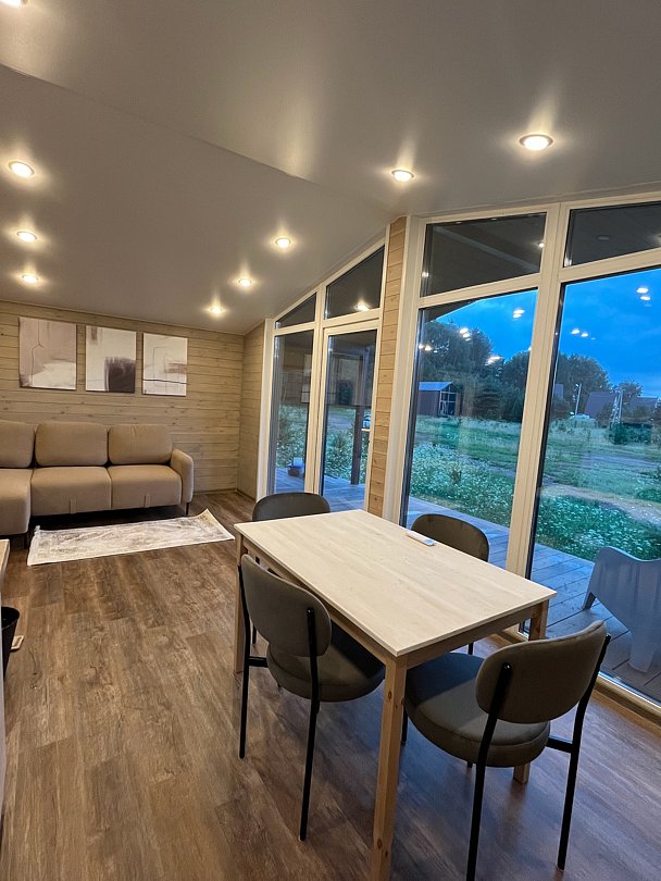 В доме две комнаты, в каждой двуспальная кровать, в гостиной раскладной диван. Во всем доме теплый пол. Кухня, душ, туалет. Мангальная зона, парковка.