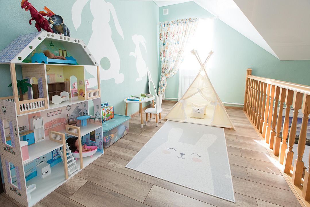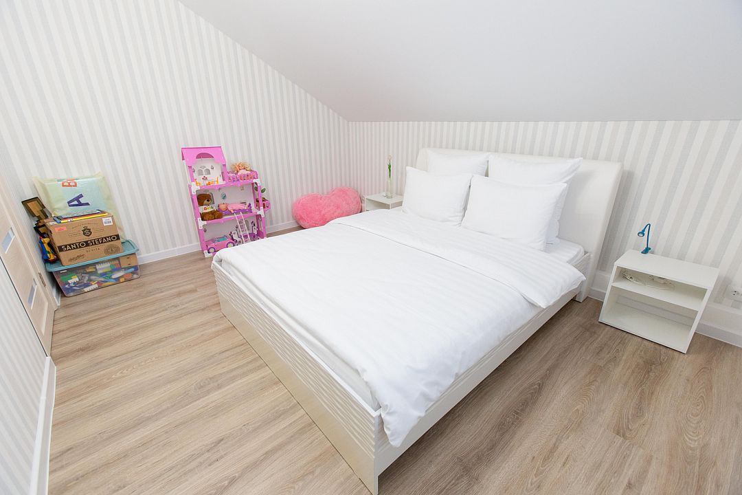На втором этаже находятся две спальни: в первой — большая двуспальная кровать и диван, а во второй — большая двуспальная кровать и полуторка, идеально подходящие для семьи или компании. Также есть детский уголок, оборудованный столом, стульчиками и игрушками.