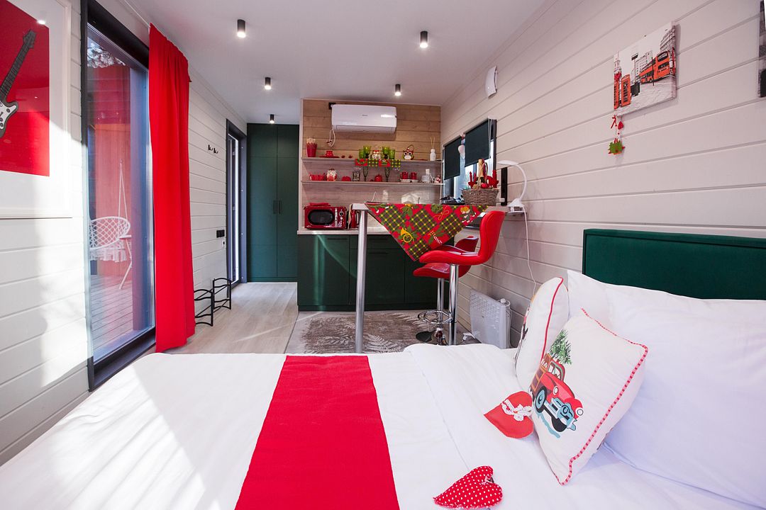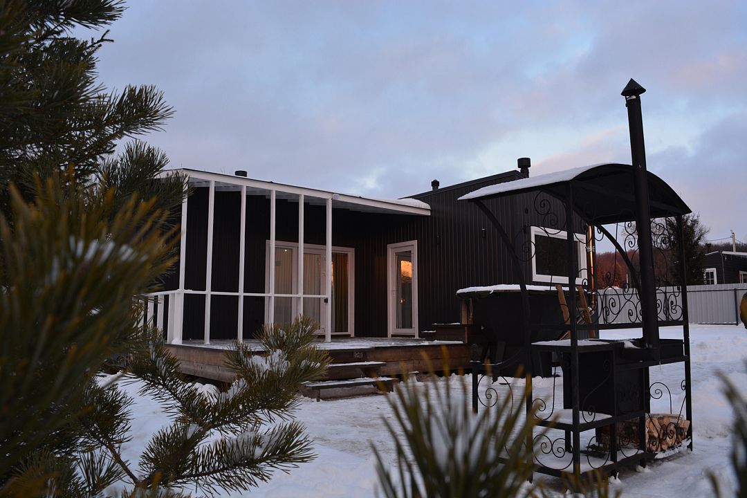 Модульный дом с террасой, банным чаном и мангальной зоной. В доме большая двуспальная кровать.