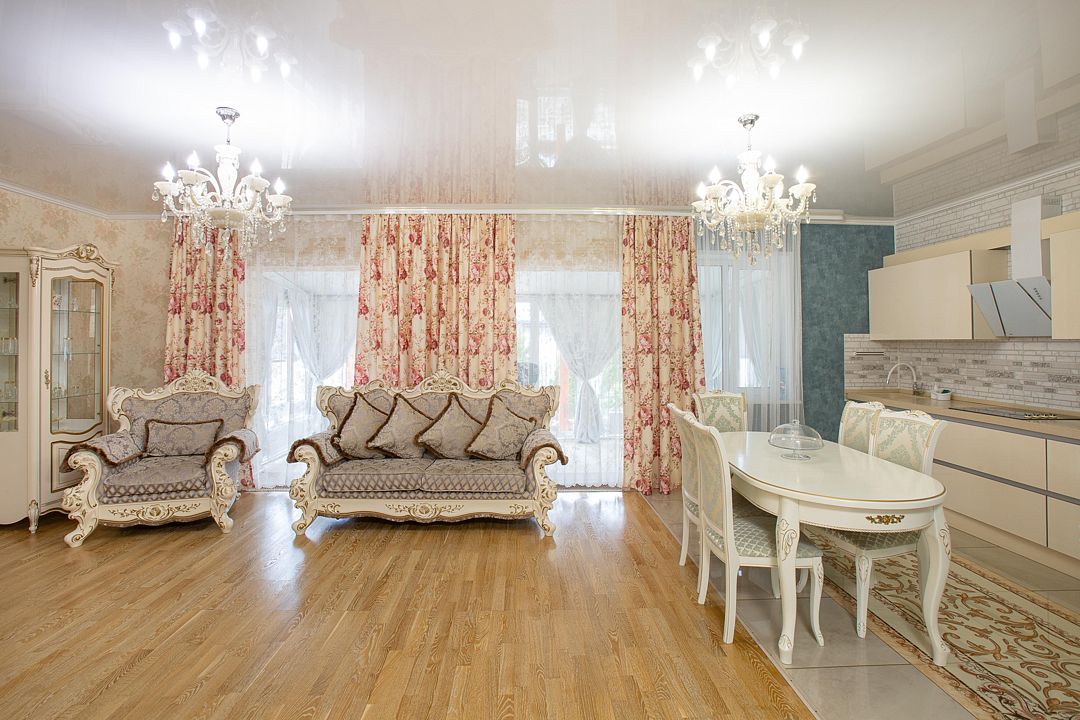 В доме на первом этаже расположена просторная гостиная с камином, комната в восточном стиле, сауна с душевой, кухня и санузел.