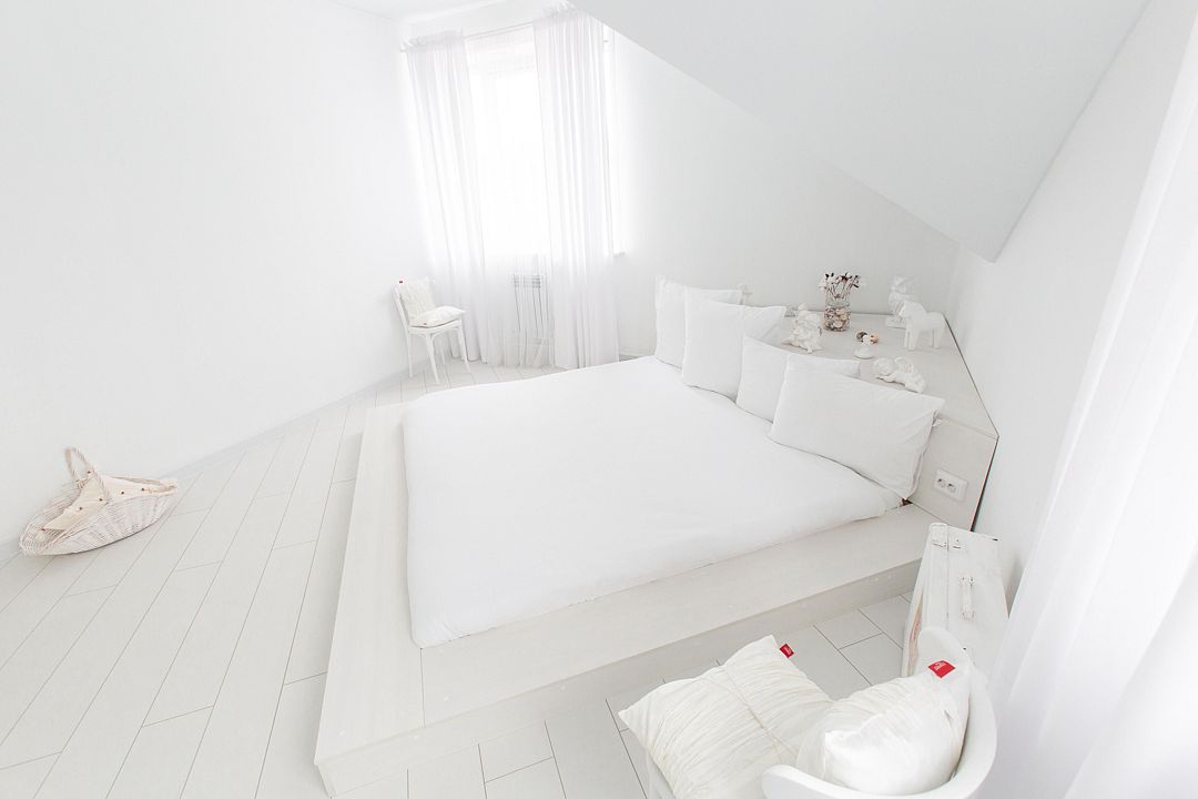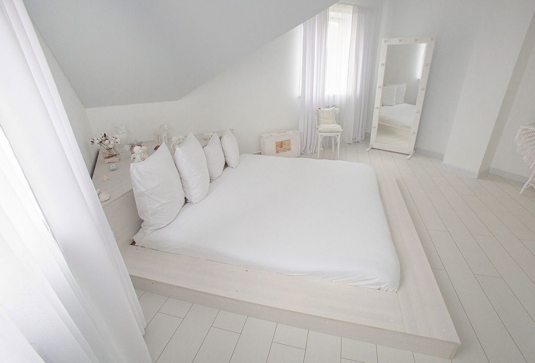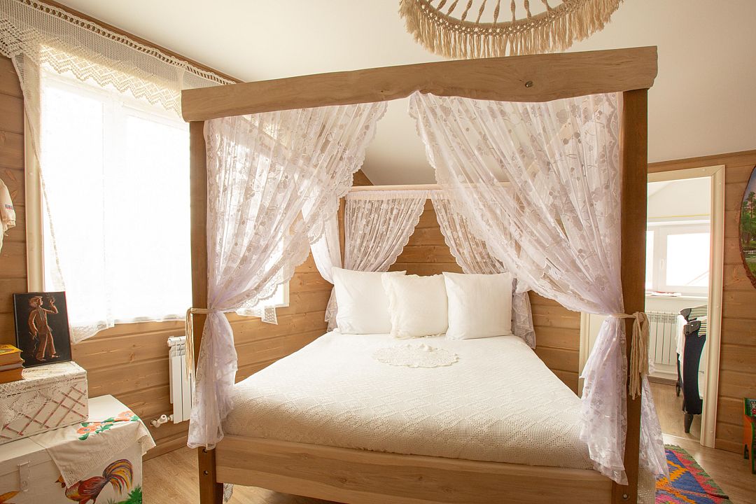 На втором этаже находятся три спальни: первая — белоснежная спальня с кроватью King-size, вторая — в стиле «Прованс» с кроватью King-size, а третья — в русско-народном стиле, также с кроватью King-size.