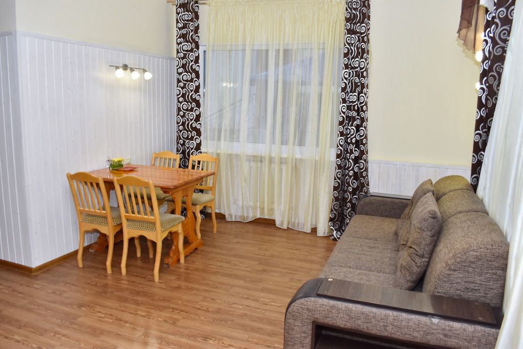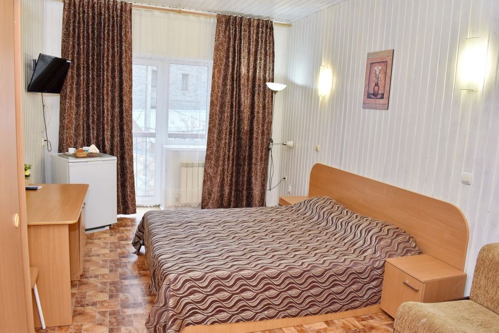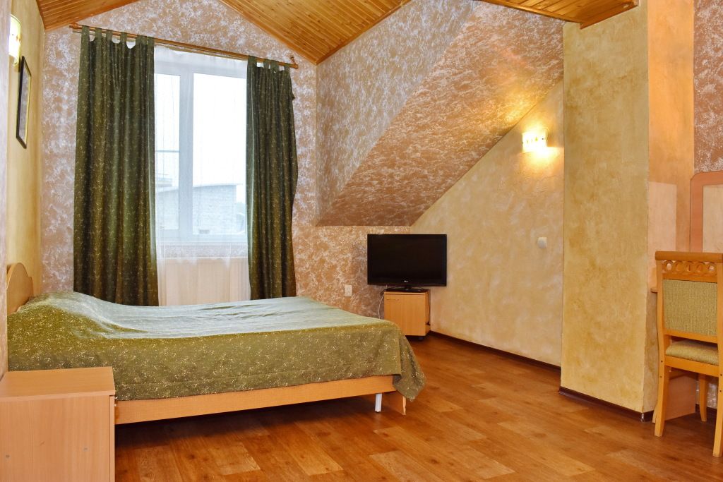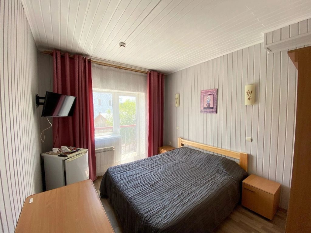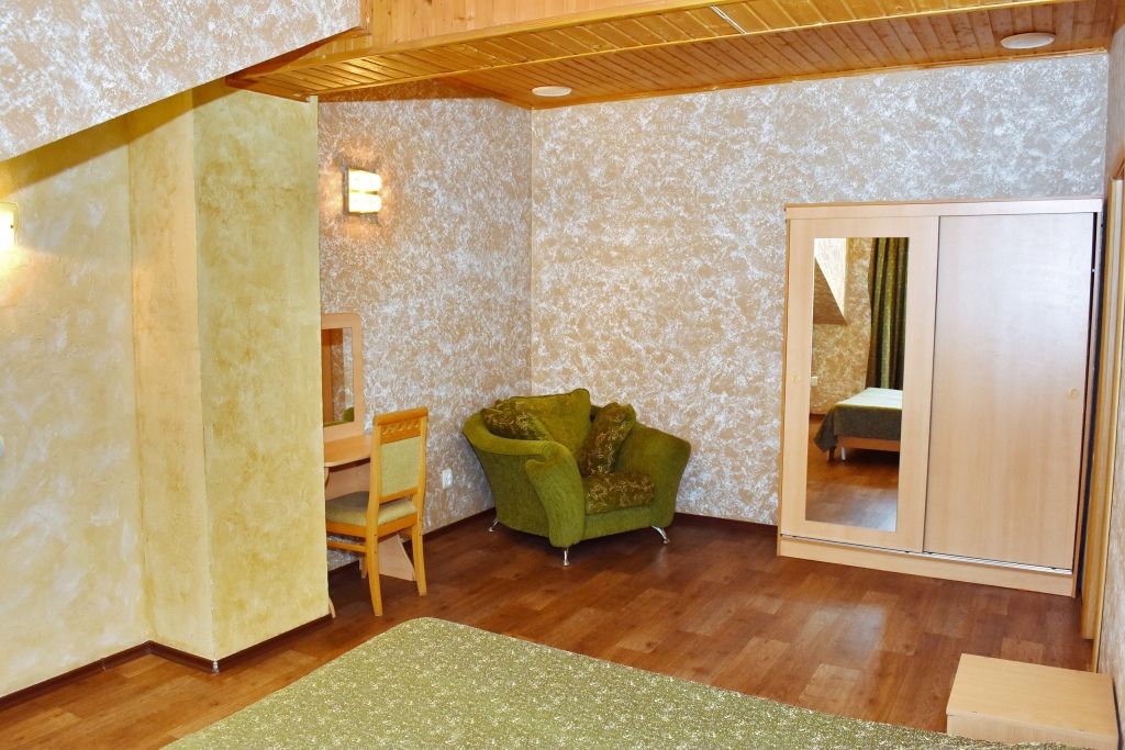 Однокомнатный номер. Находится над сауной. Площадь 20 м². В номере: двуспальная кровать + диванчик, который раскладывается, стол, холодильник, чайник. Санузел и душевая кабина.