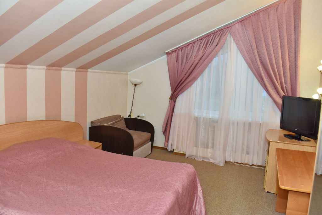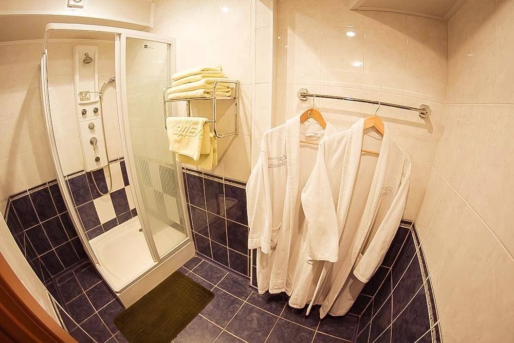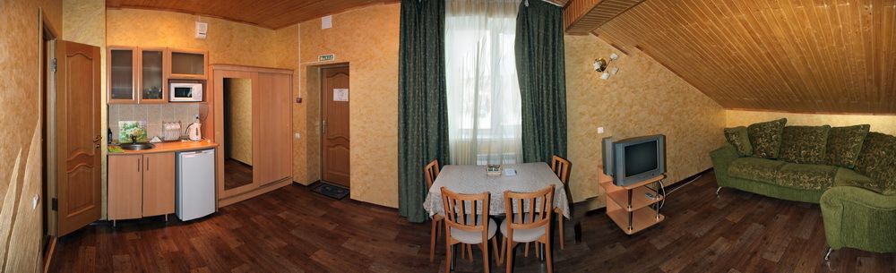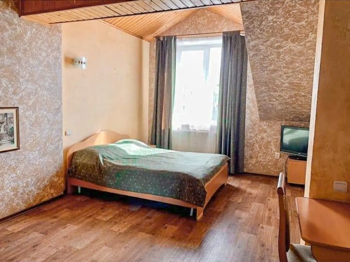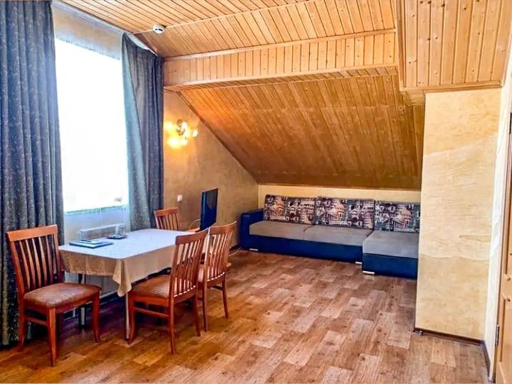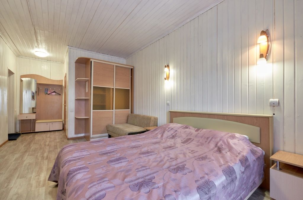 Однокомнатный номер. Находится над сауной. Площадь 20 м². В номере: двуспальная кровать + диванчик, который раскладывается, стол, холодильник, чайник. Санузел и душевая кабина.