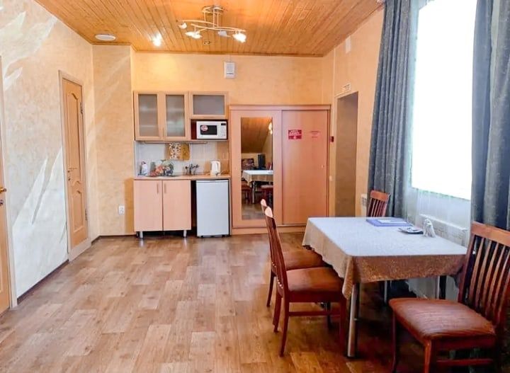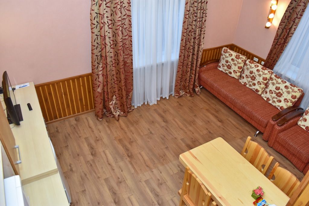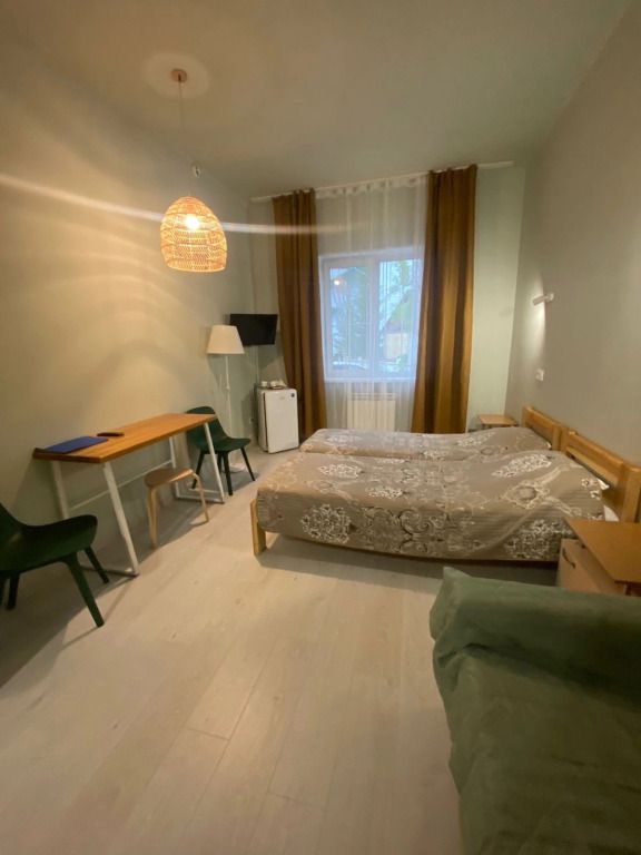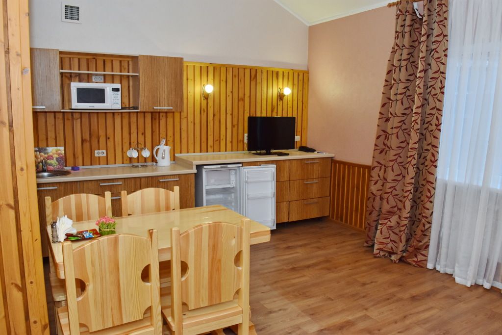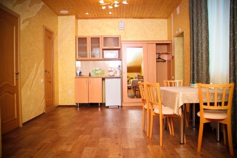 Однокомнатный номер на третьем этаже. Санузел с душевой кабиной находится на этаже, рядом с номером. В номере: двухместный раскладной диван, стол со стульями, ТВ, кухонная зона с чайником, микроволновкой, холодильником, чайными принадлежностями.