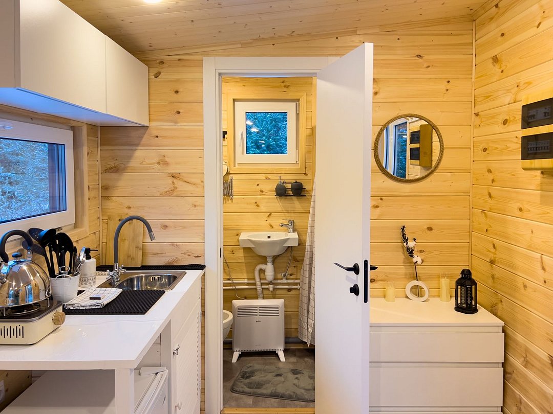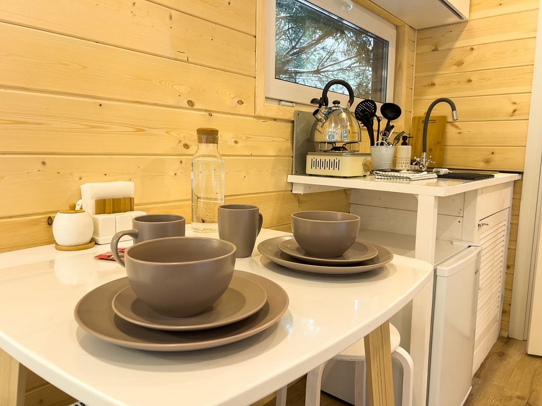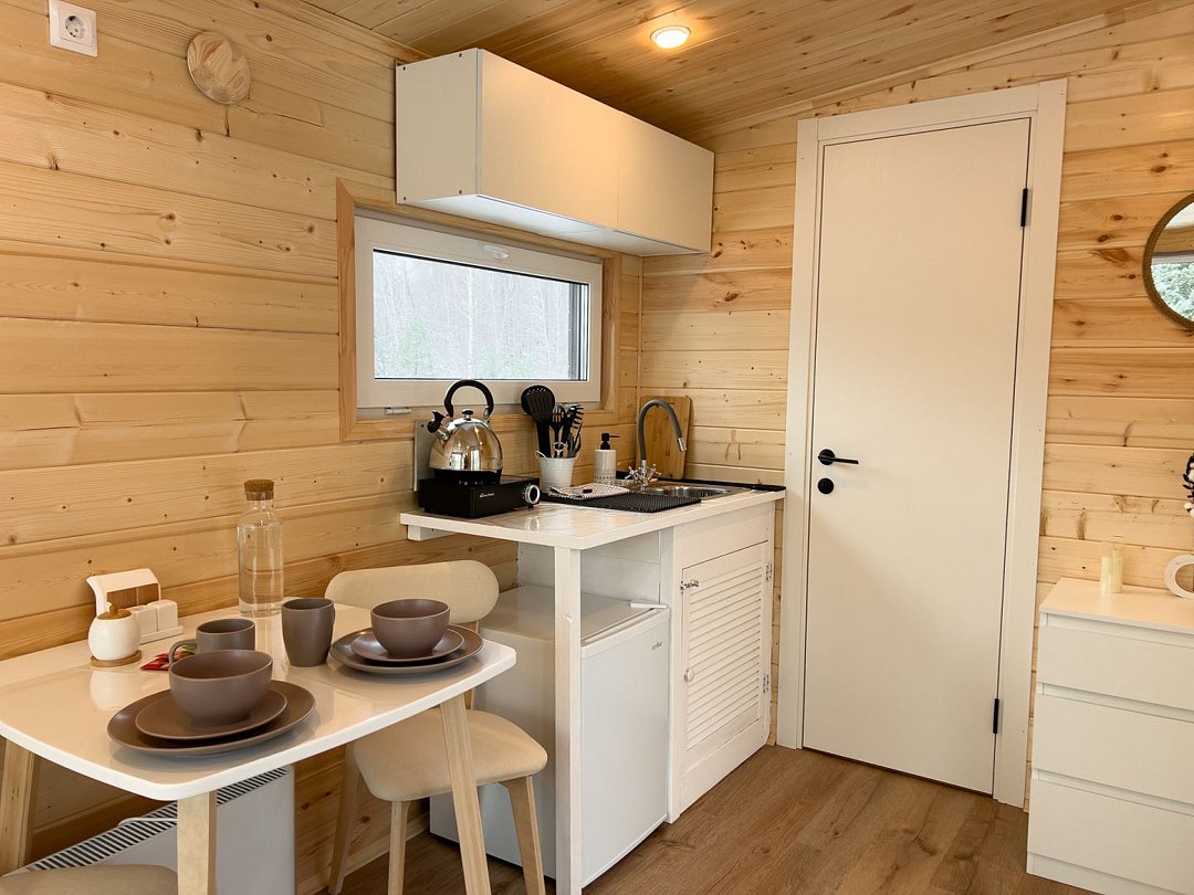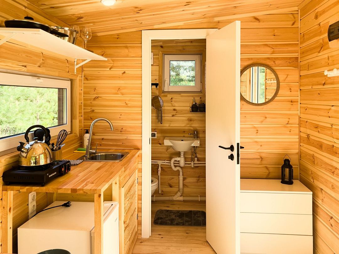 В доме с большим панорамным окном есть двуспальная кровать, кухня, мини-бар и санузел с душем, есть терраса с мебелью и все принадлежности для барбекю.