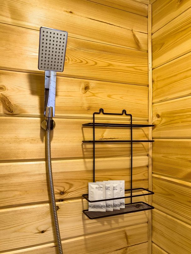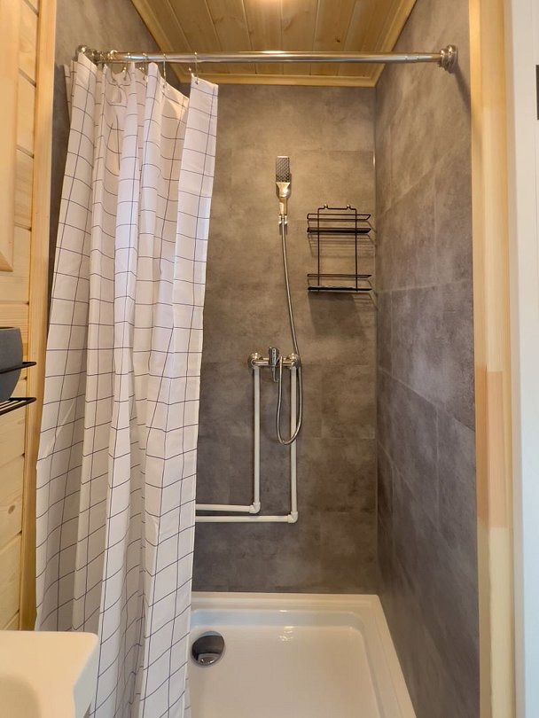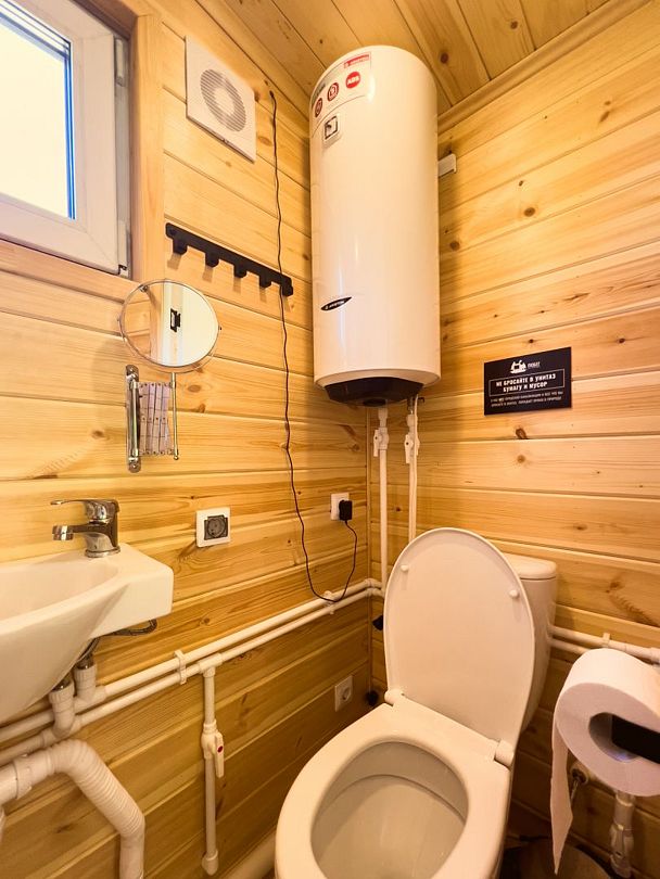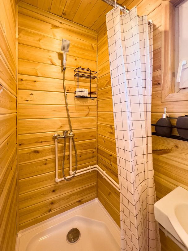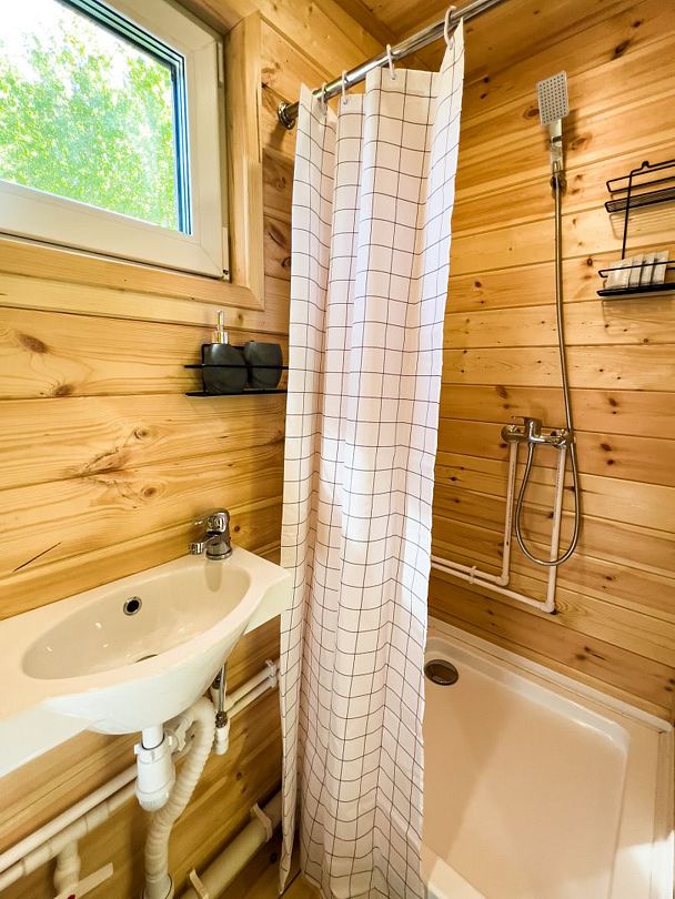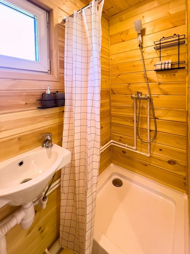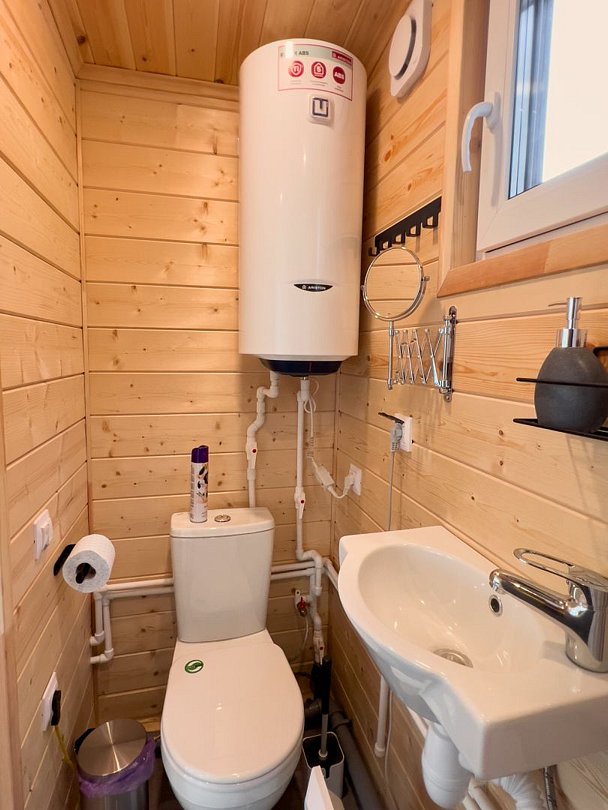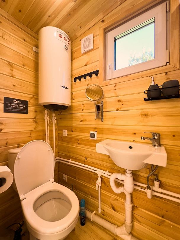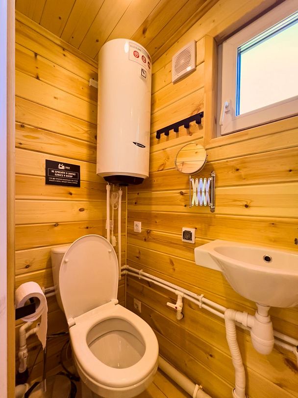 Туалет и душевые индивидуальные, находятся в отдельном санитарном модуле (полноценное, отапливаемое помещение), который стоит на территории комплекса.