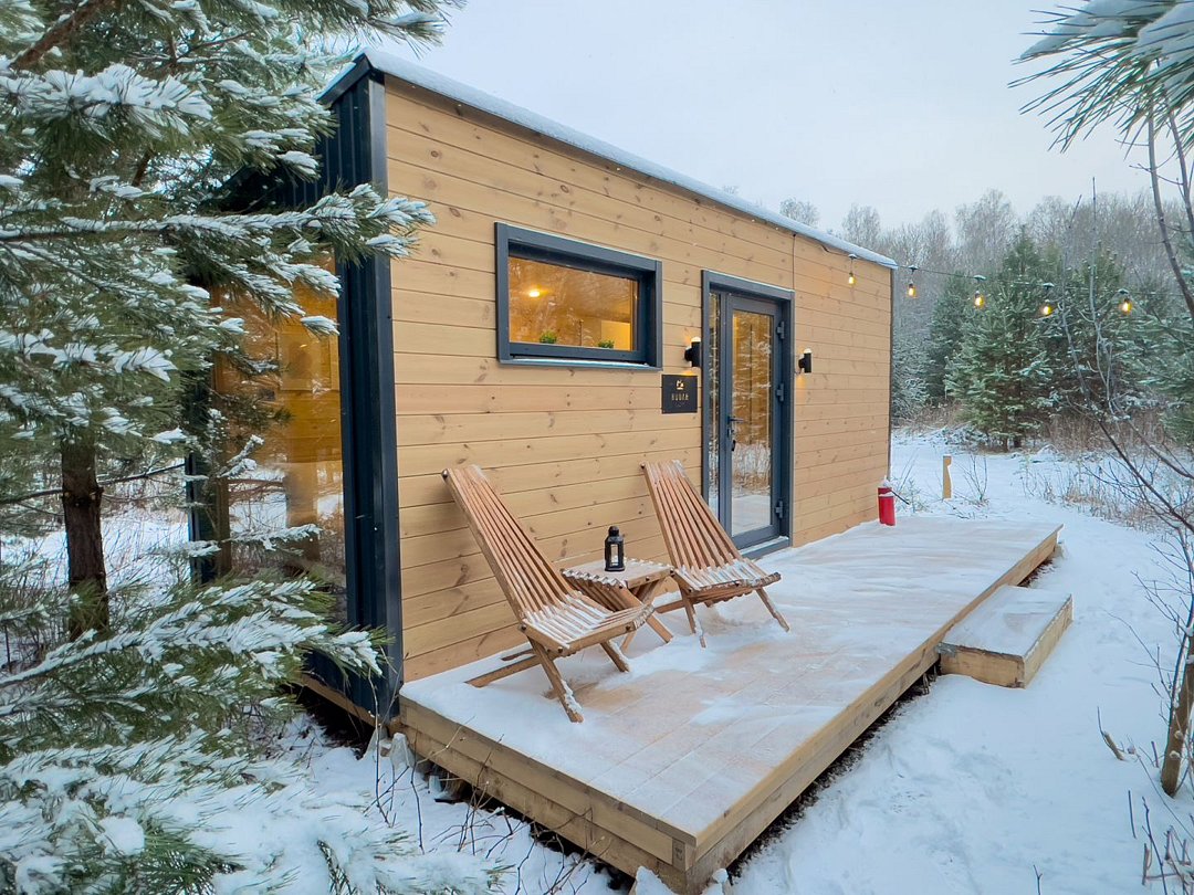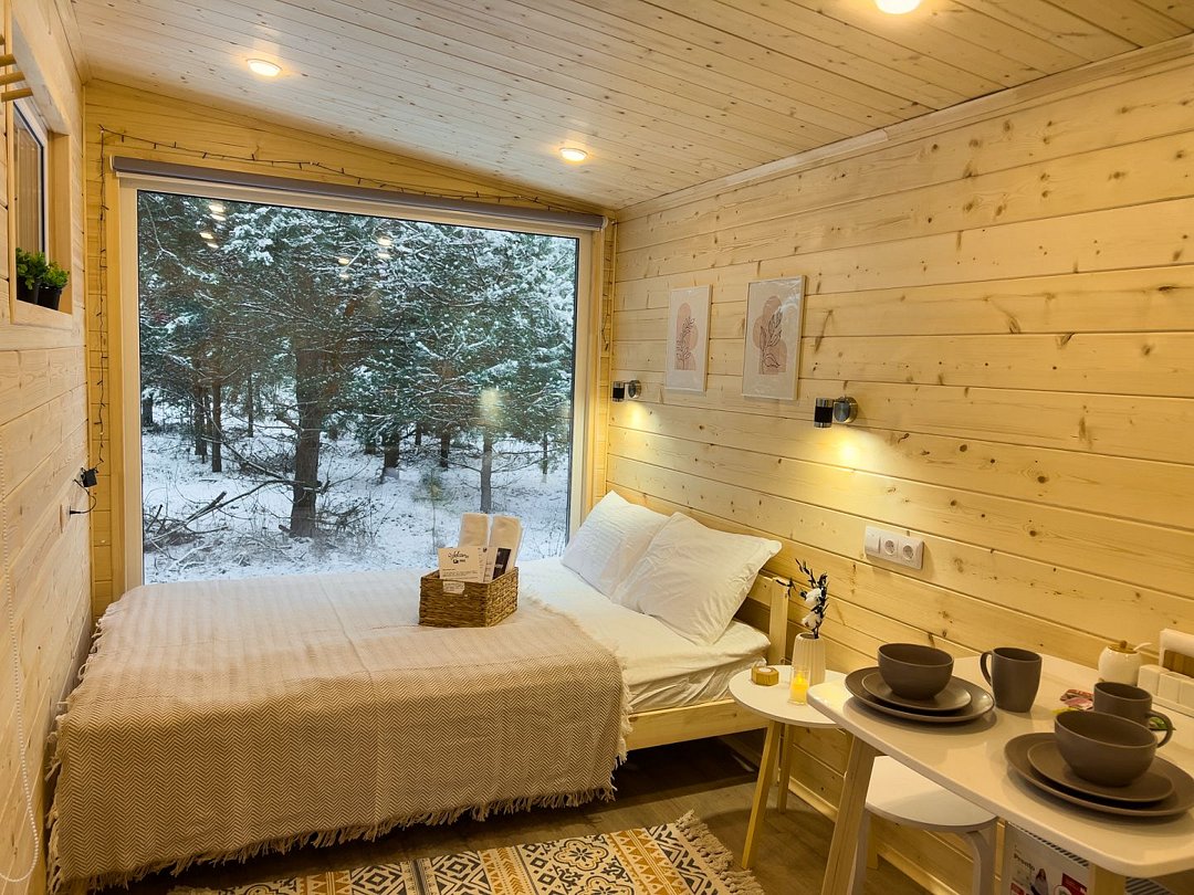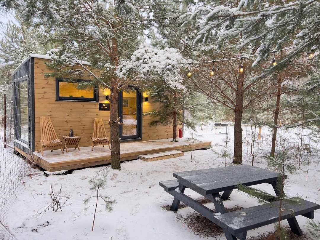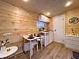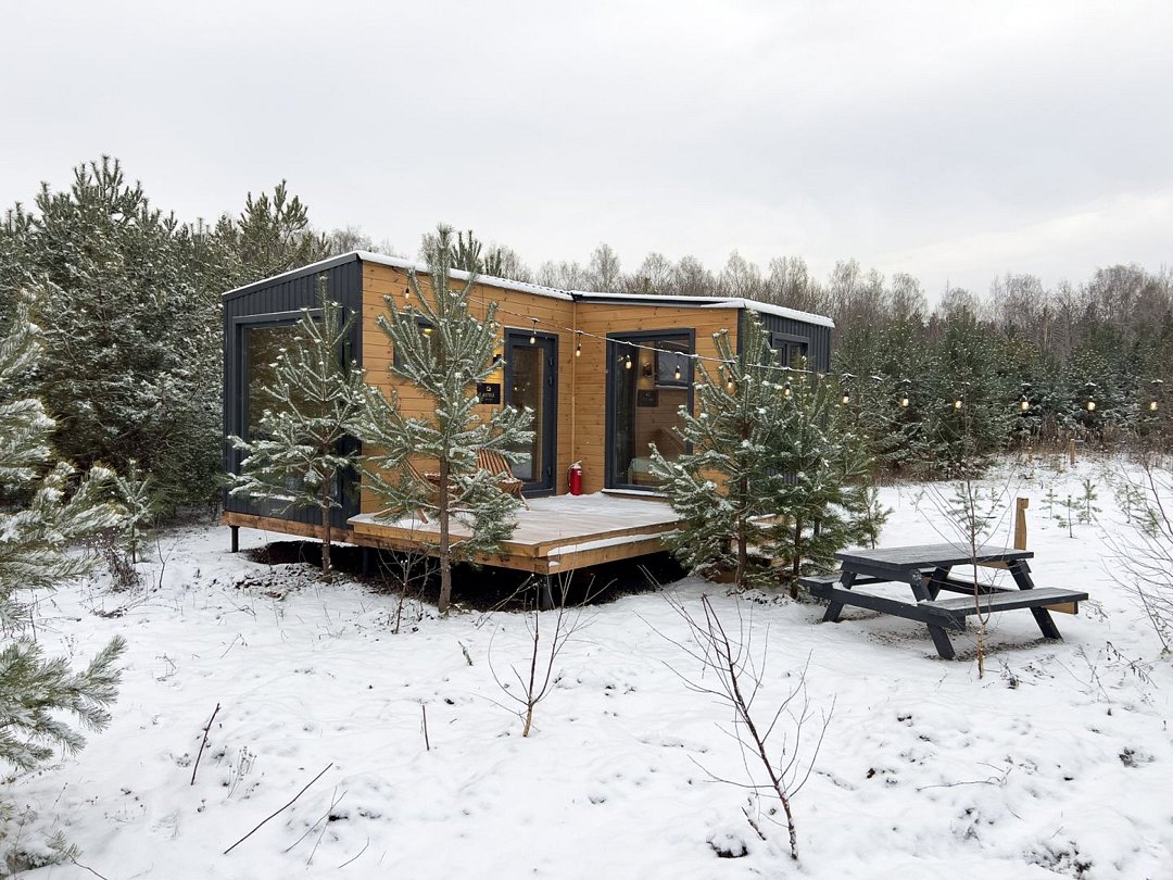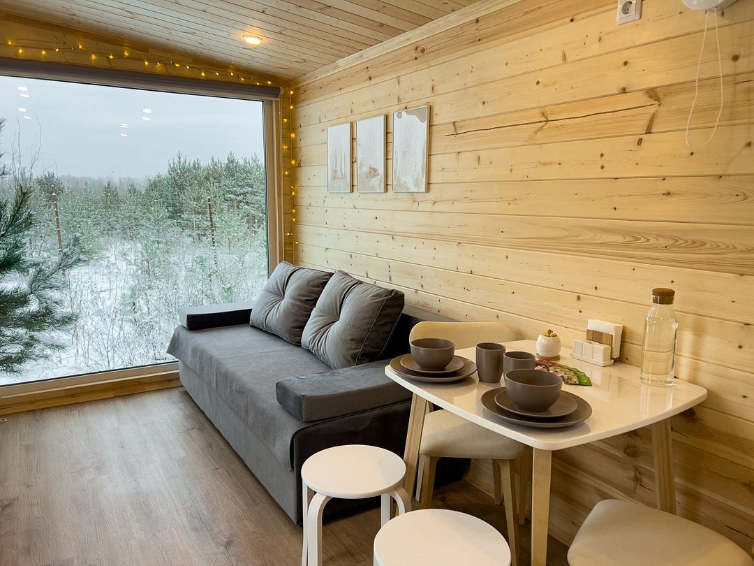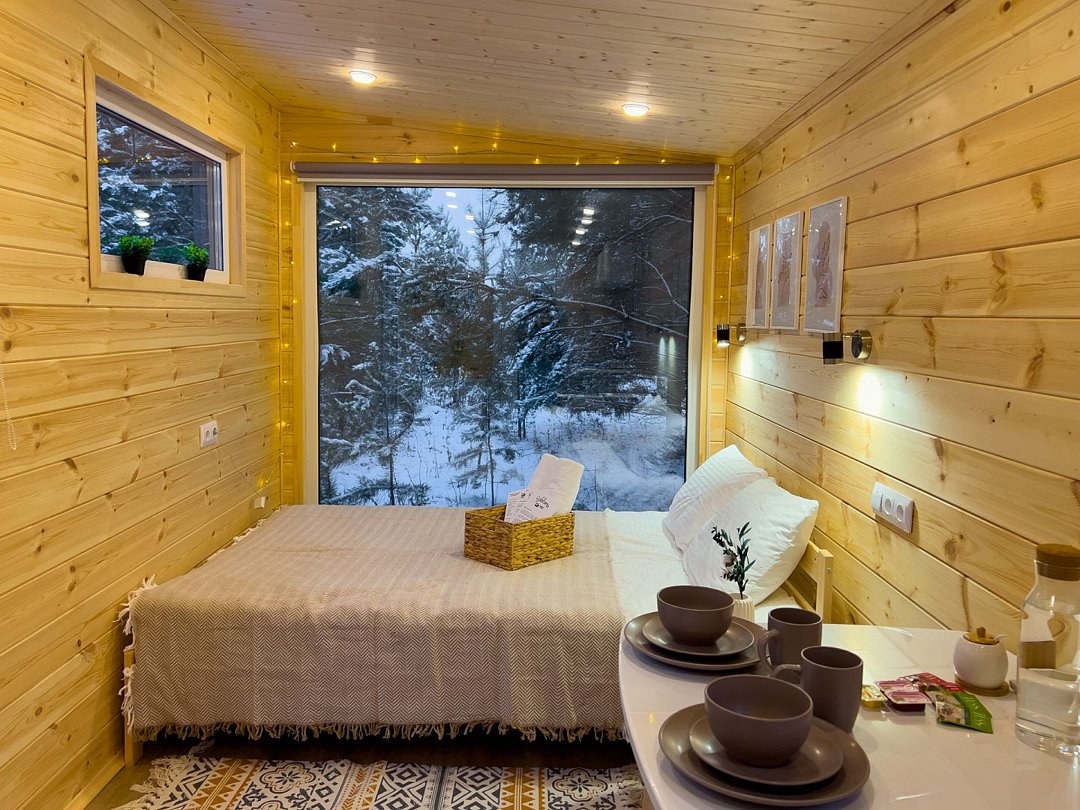 Одномодульный уютный домик — БУДАР В доме с большим панорамным окном есть кухня, холодильник и санузел с душем, есть терраса с мебелью и все принадлежности для барбекю. Домик оборудован электрическими конвекторами, у вас всегда будет тепло!