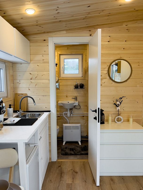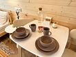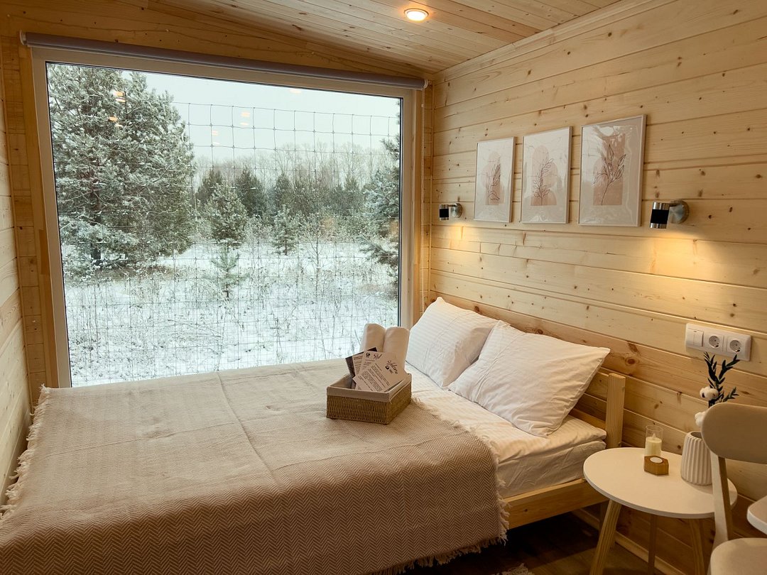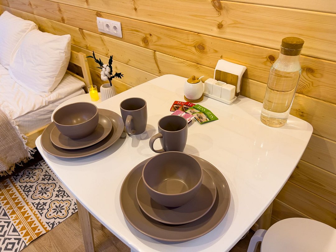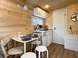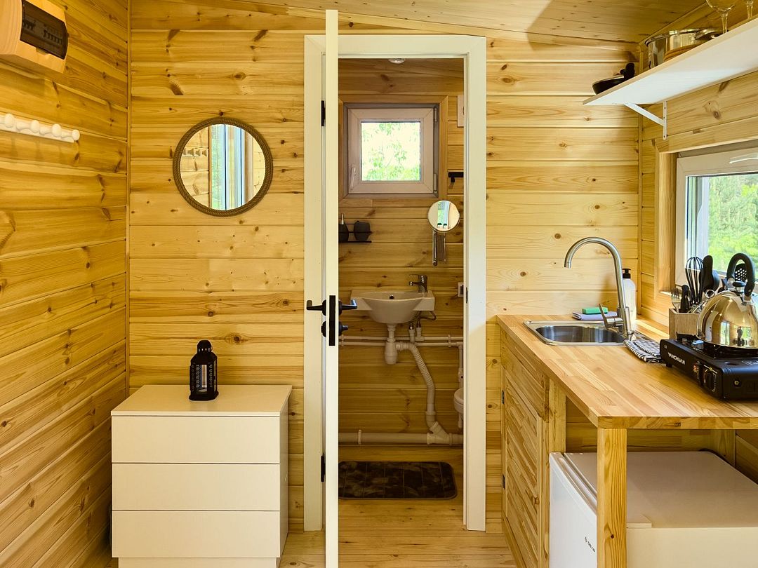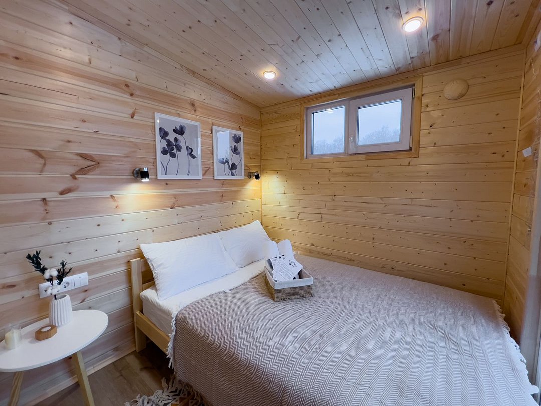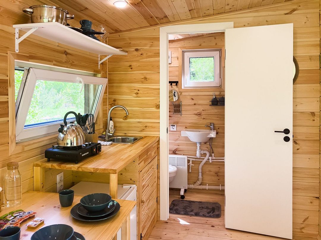 Одномодульный уютный домик — БУДАР В доме с большим панорамным окном есть кухня, холодильник и санузел с душем, есть терраса с мебелью и все принадлежности для барбекю. Домик оборудован электрическими конвекторами, у вас всегда будет тепло!