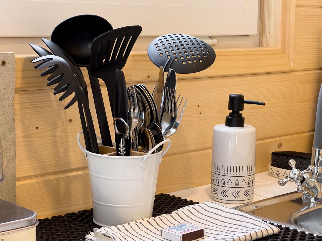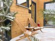В доме на четырех человек с большим панорамными окнами есть две комнаты: в одной из них находится двуспальная кровать, а в другой раздвижной диван, а также кухня, мини-бар и санузел с душем, есть терраса с мебелью и все принадлежности для барбекю.