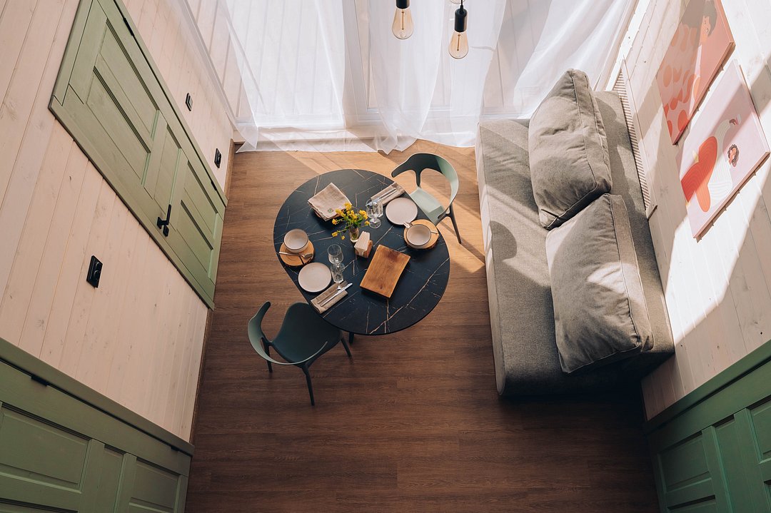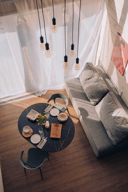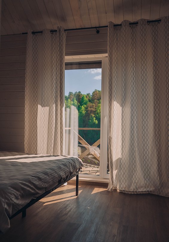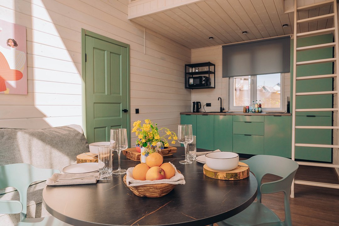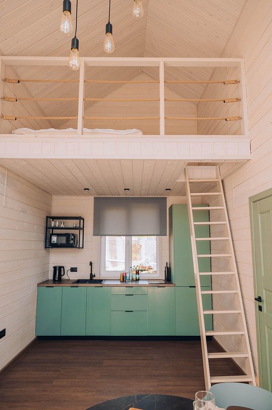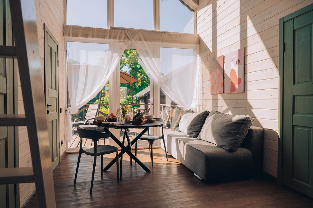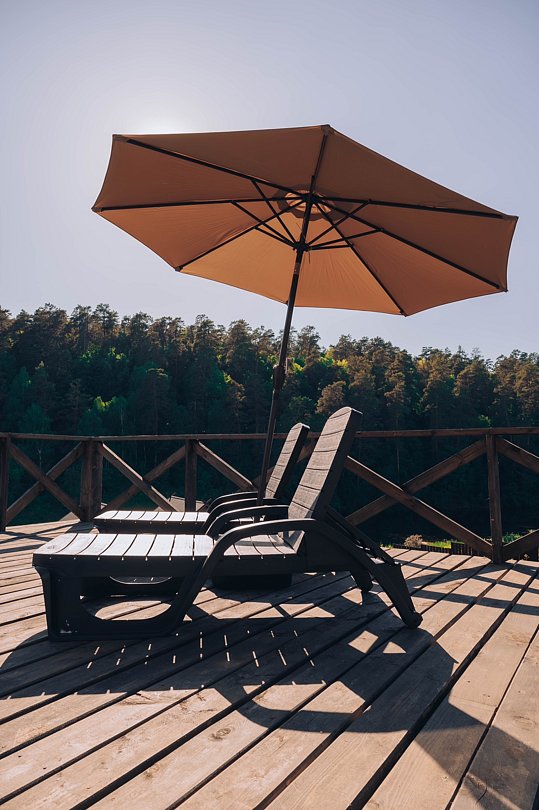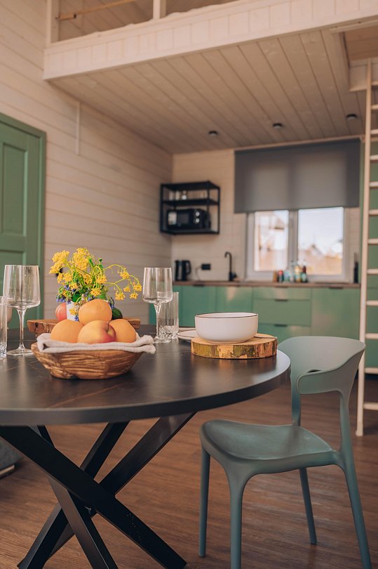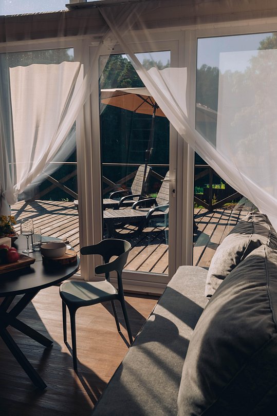 Гостевой домик с панорамными окнами, из которых открывается прекрасный вид на территорию глэмпинга, реку и лес. Есть отдельная спальня с двуспальной кроватью и балконом, мансардный этаж с двуспальной кроватью, кухня-гостиная с выходом на террасу. На террасе есть шезлонги и зонт.