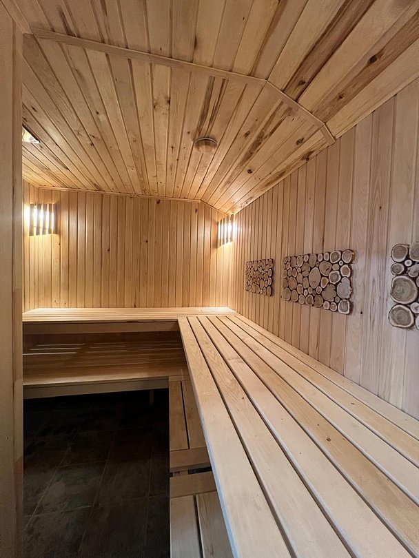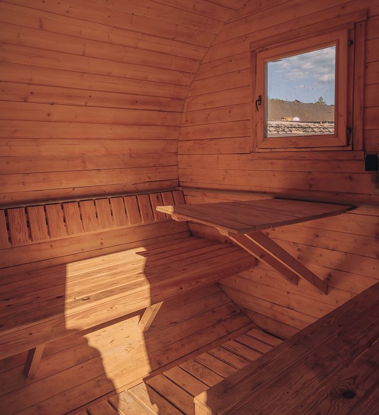 На берегу реки, среди живописных пейзажей, расположена сауна глэмпинга, способная принять шестерых гостей. Здесь есть комната для парения, душевая, туалет и просторная зона отдыха с видом на лес, что позволяет полностью расслабиться и насладиться природой.