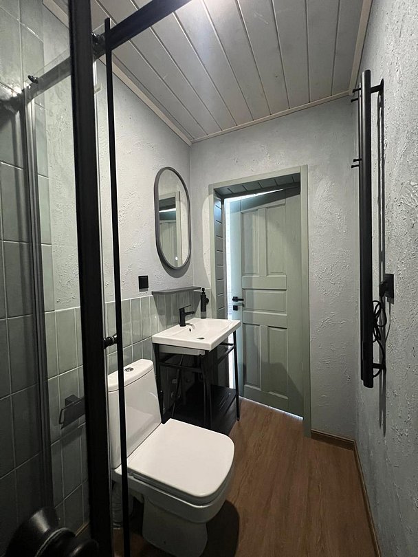 Также в домике есть санузел с душевой кабиной и отдельная гардеробная комната с зеркалом.
