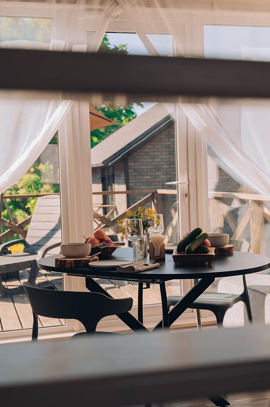 Просторные спальни с видом на лес и реку приглашают отдохнуть после насыщенного дня. Кухня-гостиная с современной техникой и удобной мебелью позволяет наслаждаться кулинарными изысками, не выходя из дома. Террасы с шезлонгами приглашают полюбоваться красотой природы и насладиться ее дарами.