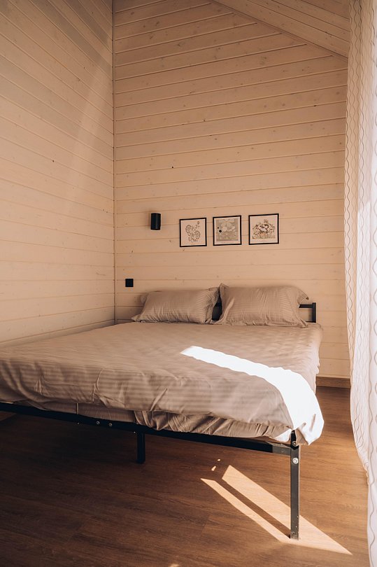 В каждом домике есть: спальня с двухспальной кроватью и видом на лес и реку; кухня-гостиная со всем необходимым для комфортного пребывания; ванная комната с косметикой для душа; гардеробная комната с зеркалом; терраса с шезлонгами.