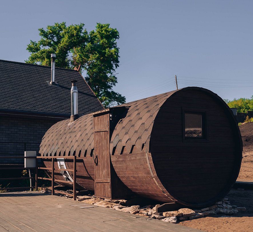 Баня-бочка, расположенная рядом с пирсом и мини-бассейном, приглашает отдохнуть небольшой компанией до четырех человек. Внутри предусмотрена традиционная парилка, душевая и уютная зона отдыха.