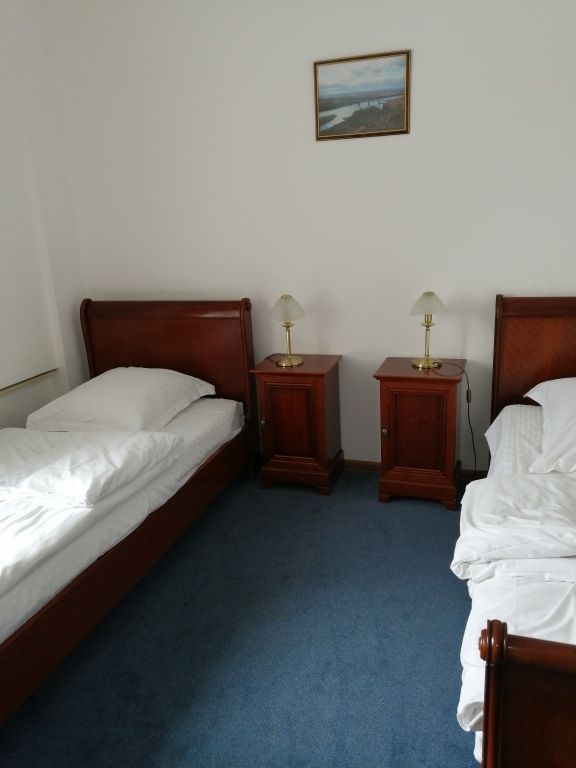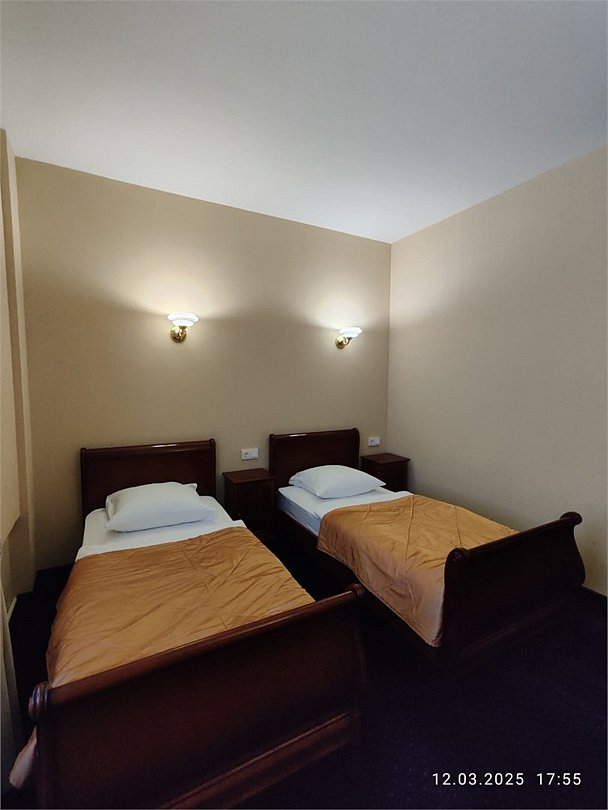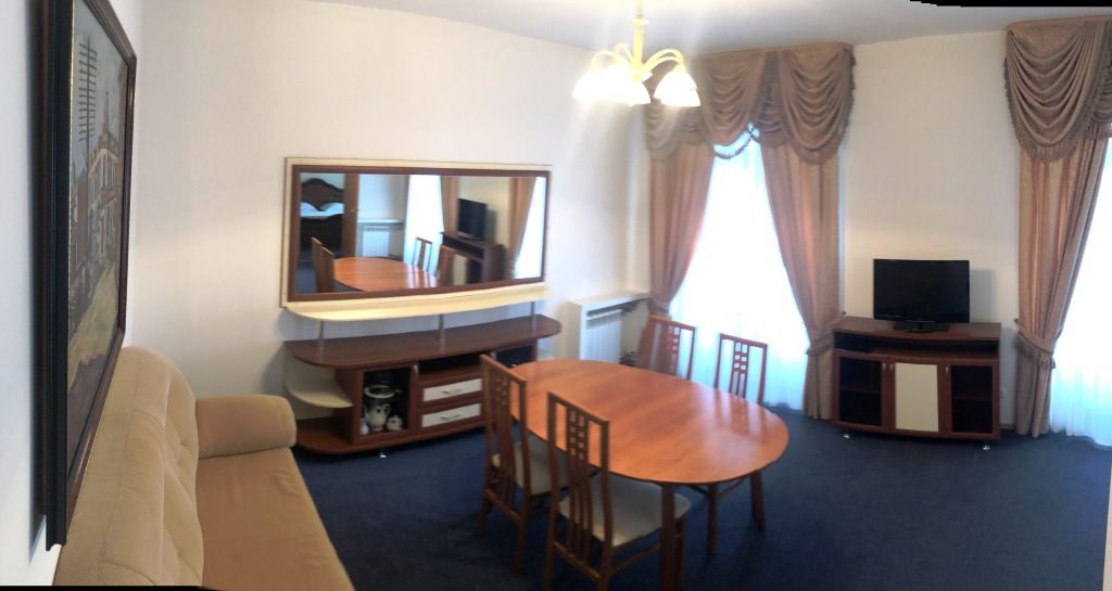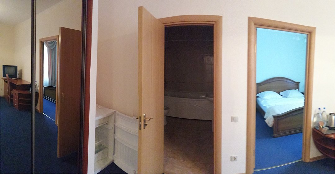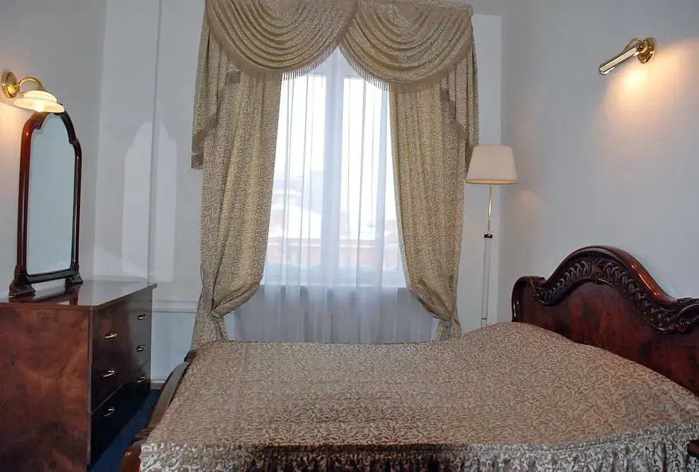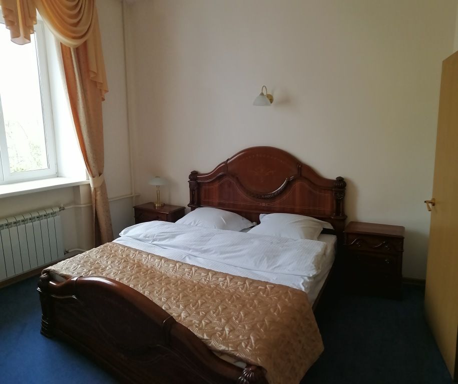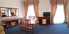 Двухкомнатный номер в классическом стиле. Состоит из спальни и гостиной. В спальне две односпальные кровати, в гостинной широкая кровать и, зона со столом и телевизором. Предоставляется махровый халат. Возможные варианты размещения помимо одноместного: двое на одной кровати, основное плюс доп кровать, основное плюс две доп кровати, двое на одной кровати + одна или две доп кровати (просим уточнять при бронировании варианты размещения).Услуги и удобства