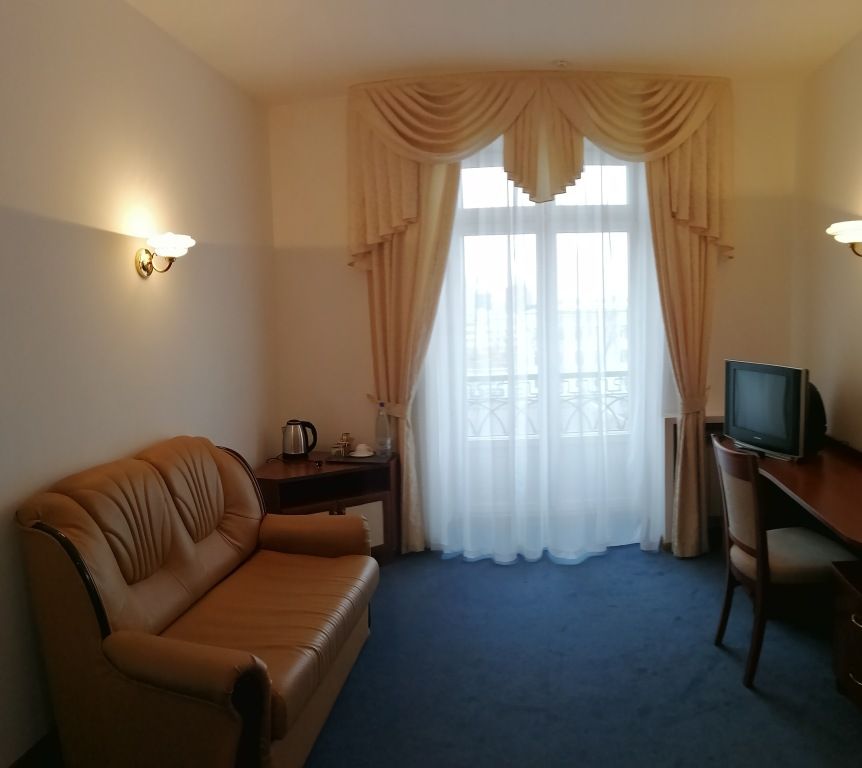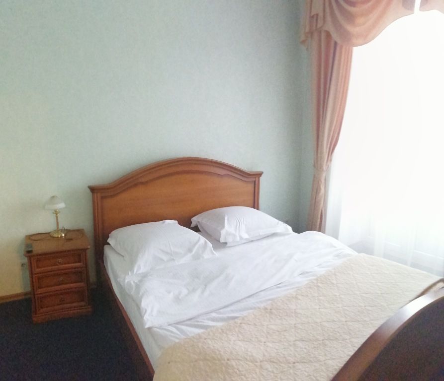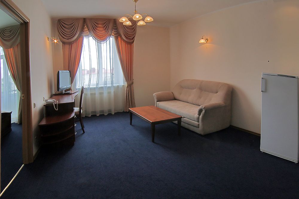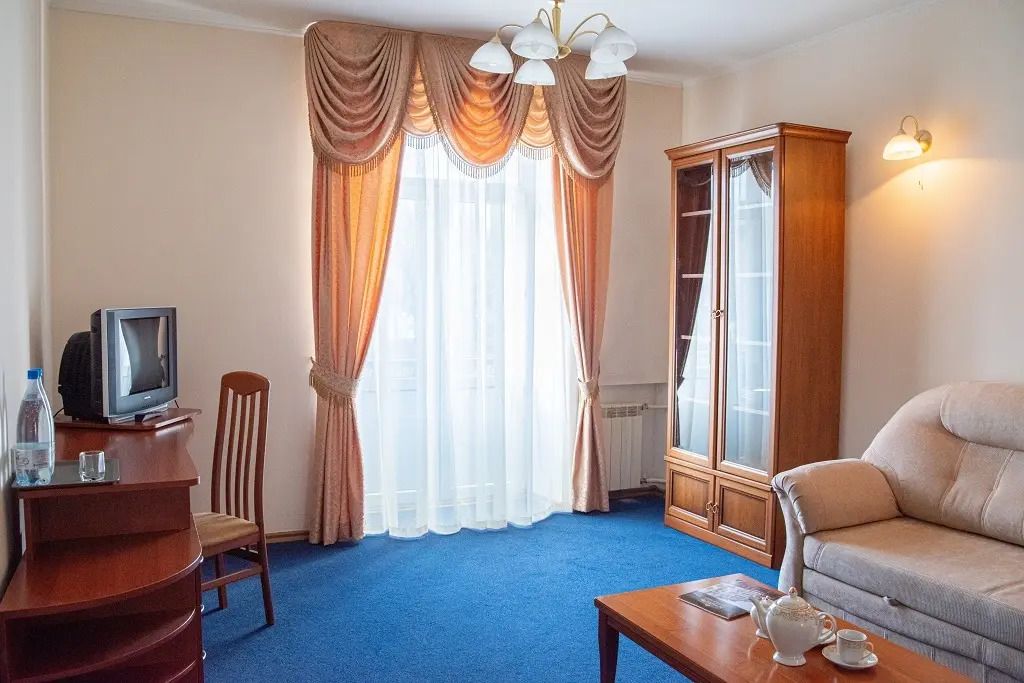 Двухкомнатный номер в классическом стиле. Состоит из спальни и гостиной. В спальне широкая кровать; в гостиной мягкая мебель (диван-кровать), зона со столом и телевизором. Предоставляется махровый халат. Возможные варианты размещения помимо одноместного: двое на одной кровати, основное плюс диван, двое на одной кровати плюс один или двое двое на диване (просим уточнять при бронировании варианты размещения).Услуги и удобства