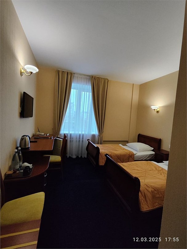 телевизор, кабельное телевидение, Wi-Fi, телефон, настольные лампы, фен, вентилятор, душевая кабина, санузел, банные полотенца, тапочки, гигиенические средства, две односпальные кровати, стулья, шкаф для одежды, письменные принадлежности, чайный набор, чайник, унитаз, раковина, вид на город, кулер на этаже, вид во двор, стаканы, тумба, туалетные средства, туалет, мини-холодильник, шкаф-купе, гостиничная парфюмерия, номер для некурящих, рабочий стол, вешалки-плечики, бутилированная вода, без питомцевВ гостиничном номере