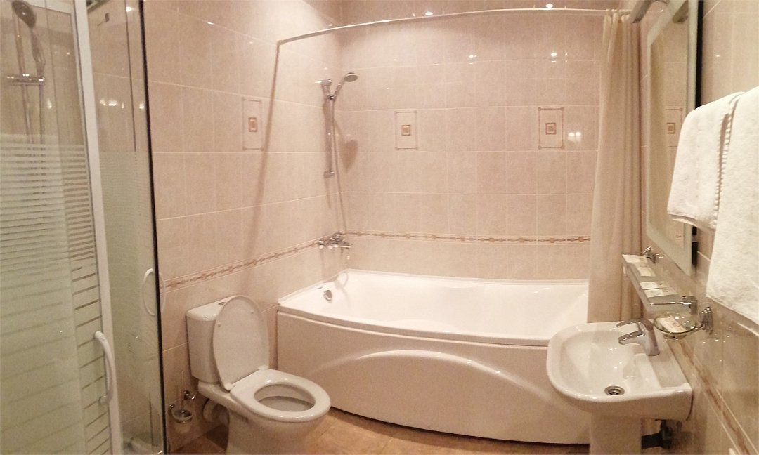 телевизор, кабельное телевидение, Wi-Fi, холодильник, фен, электронные замки, утюг, ванная комната, душевая кабина, ванна, халаты, банные полотенца, тапочки, двуспальная кровать, гладильная доска, диван, стулья, вешалки, журнальный столик, зеркало, комод, чайный набор, чайник, унитаз, вид на город, вид во двор, стул, стол, тумба, туалетные средства, туалет, диван-кровать, раскладной диван, внутренний телефон, мини-холодильник, шкаф-купе, гостиничная парфюмерия, вешалки-плечики, бутилированная водаВ гостиничном номере