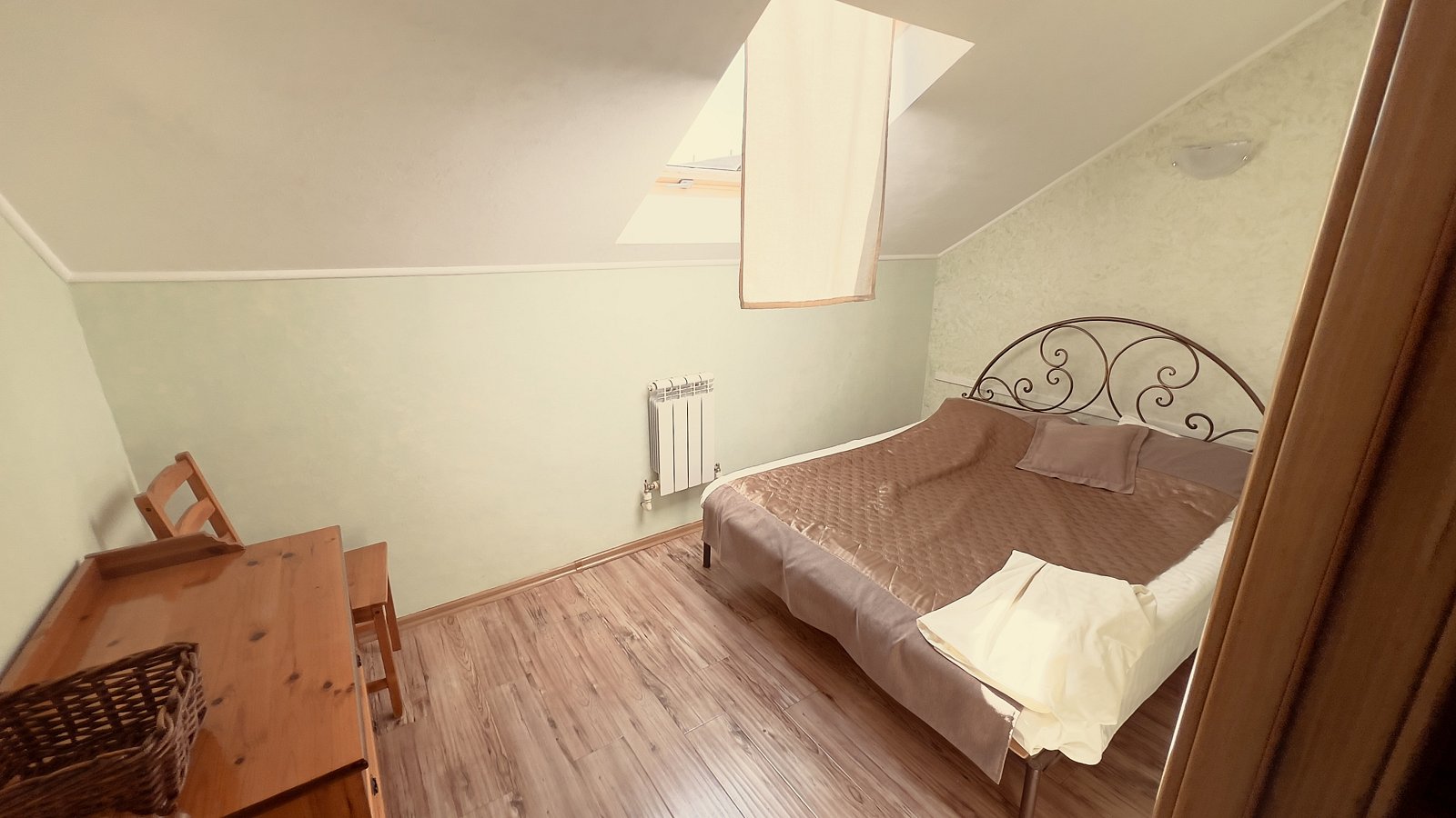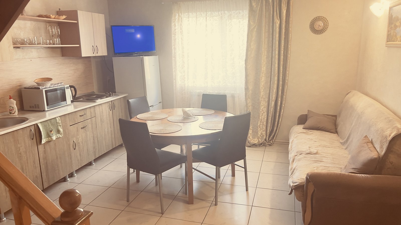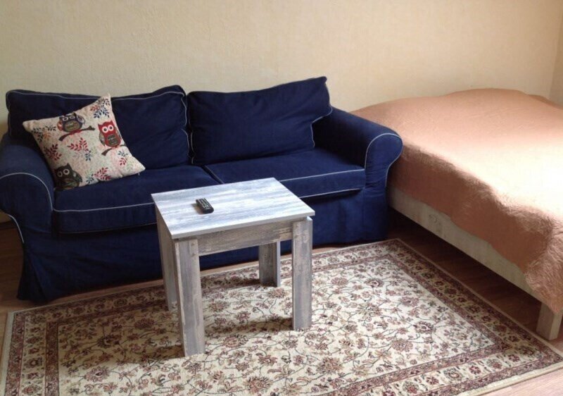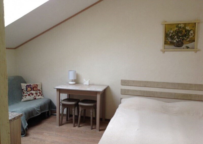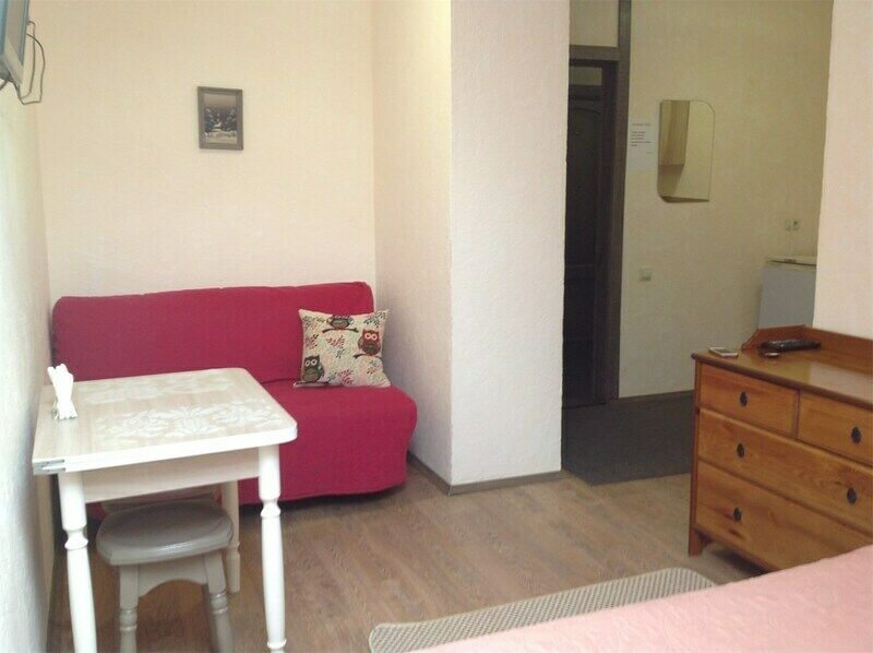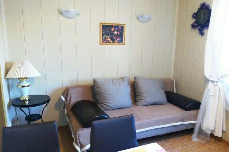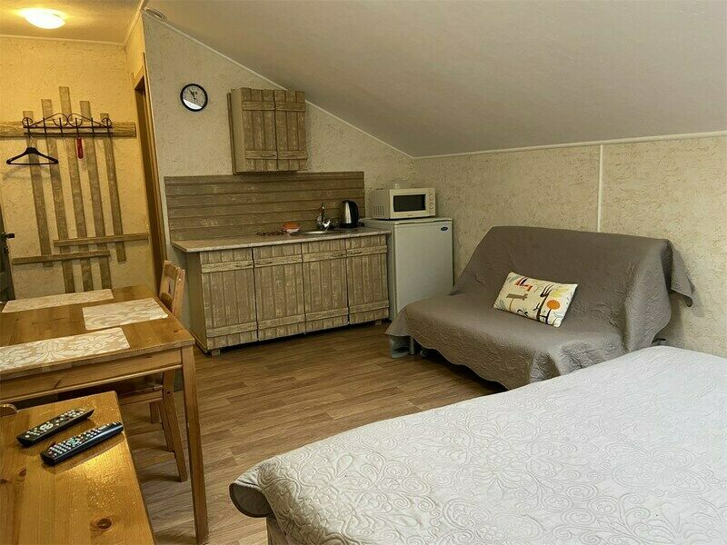 Размещение на двух человек. Комната с телевизором, двухспальной кроватью. Есть кухонный уголок, постельное белье. Дополнительное место — раскладной диван.