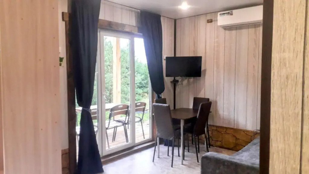 Глэмпинг представляет собой круглогодичный комплекс из домиков формата А-фрейм – Тропики, Корабль, Мозаика, и двух домиков Близнецы. Все дома предусматривают размещение для 5 человек, с возможностью дополнительного места на раскладушке. В номерах установлены двуспальные кровати, раскладывающийся диван, кресло-кровать, есть телевизор и кондиционер. Полностью укомплектована кухня – плита для приготовления еды, микроволновая печь, холодильник, чайник, посуда. Санузел совмещенный, с душем, феном и туалетными принадлежностями.