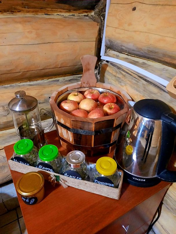 Баня или саунаБаняПлатно (Информация от 19 июня 2025) Читать полностьюК услугам гостей просторная баня из сосновых бревен. Вмещает до 8 человек и топится дровами. Комната отдыха оснащена теплыми полами. Предусмотрены отдельная моечная с душевой, парная и санузел, что позволяет арендовать баню без проживания в домах. В бане предоставляется: электрический чайник, чай из местных трав, мед и сахар. Возрастных ограничений для посещения бани нет, однако, из-за наличия горячей печи, необходим присмотр взрослых за детьми. В стоимость включен один березовый веник, шапочка и тапочки для каждого гостя. БаняОписаниеИнфраструктура: тапочки, зона отдыха, шапочки, душ, березовые веникиК услугам гостей просторная баня из сосновых бревен. Вмещает до 8 человек и топится дровами. Комната отдыха оснащена теплыми полами. Предусмотрены отдельная моечная с душевой, парная и санузел, что позволяет арендовать баню без проживания в домах. В бане предоставляется: электрический чайник, чай из местных трав, мед и сахар. Возрастных ограничений для посещения бани нет, однако, из-за наличия горячей печи, необходим присмотр взрослых за детьми. В стоимость включен один березовый веник, шапочка и тапочки для каждого гостя. СтоимостьОт 1200 ₽/часИнформация от 19 июня 2025