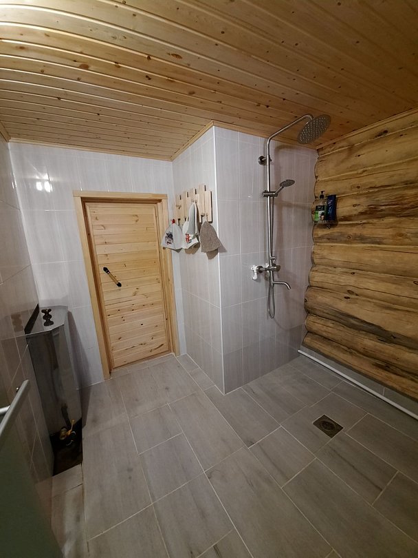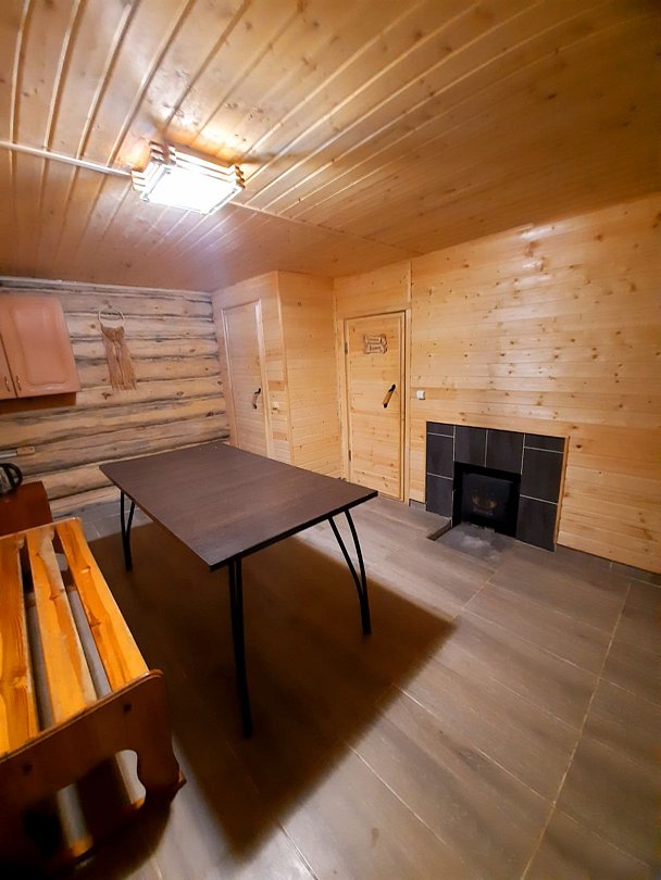 Инфраструктура: тапочки, зона отдыха, шапочки, душ, березовые веникиК услугам гостей просторная баня из сосновых бревен. Вмещает до 8 человек и топится дровами. Комната отдыха оснащена теплыми полами. Предусмотрены отдельная моечная с душевой, парная и санузел, что позволяет арендовать баню без проживания в домах.
