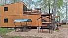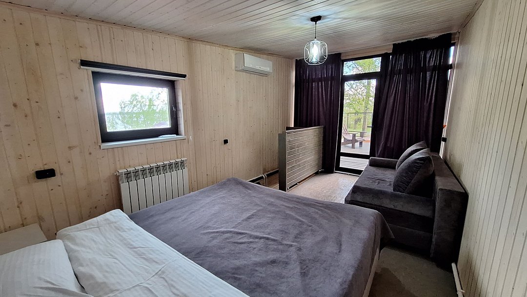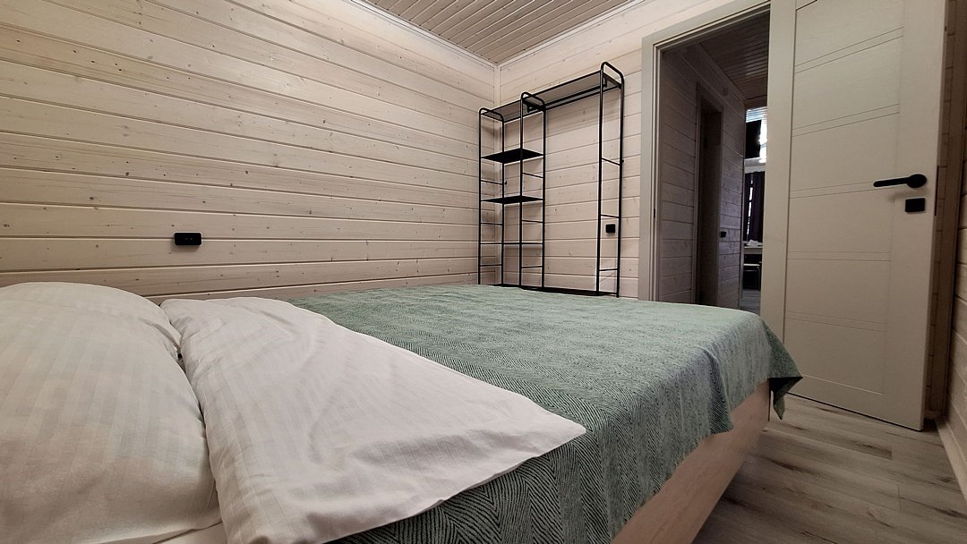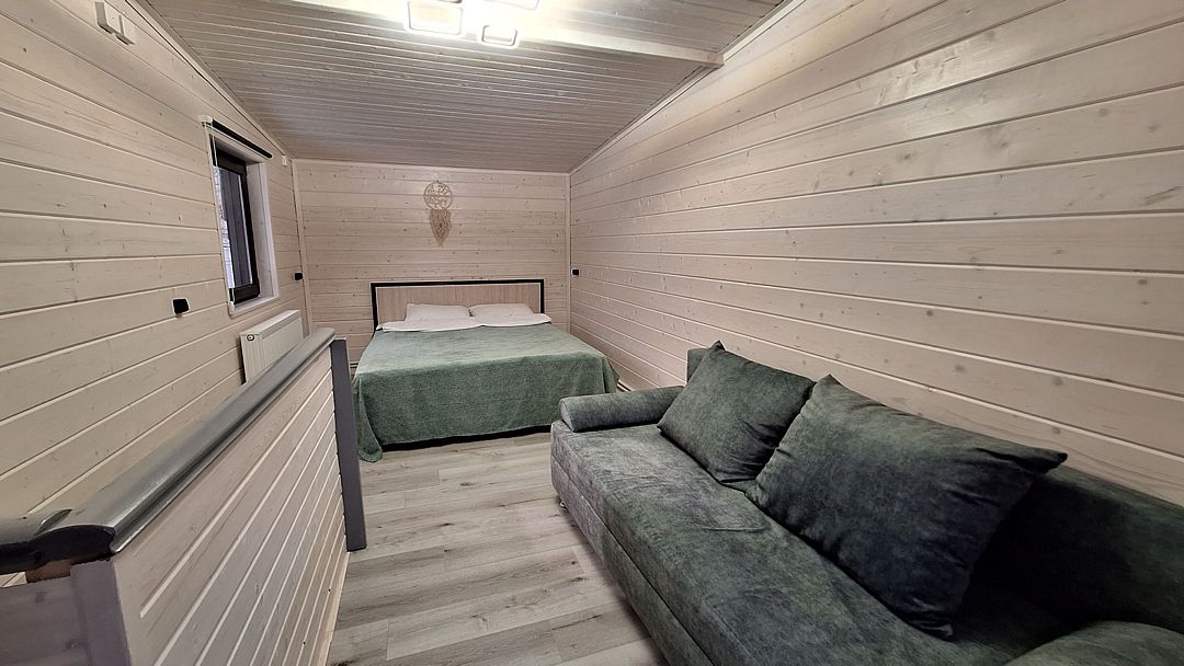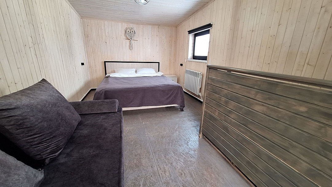 Две спальные комнаты с двуспальной кроватью 140*200 и раскладным диваном 140*190 (каждая комната на 2 взрослых и 2 ребенка). Одна комната с раскладным диваном 140*190. Терраса с качелей-кокон, столом на 10 гостей и скамейками, собственная мангальная зона.