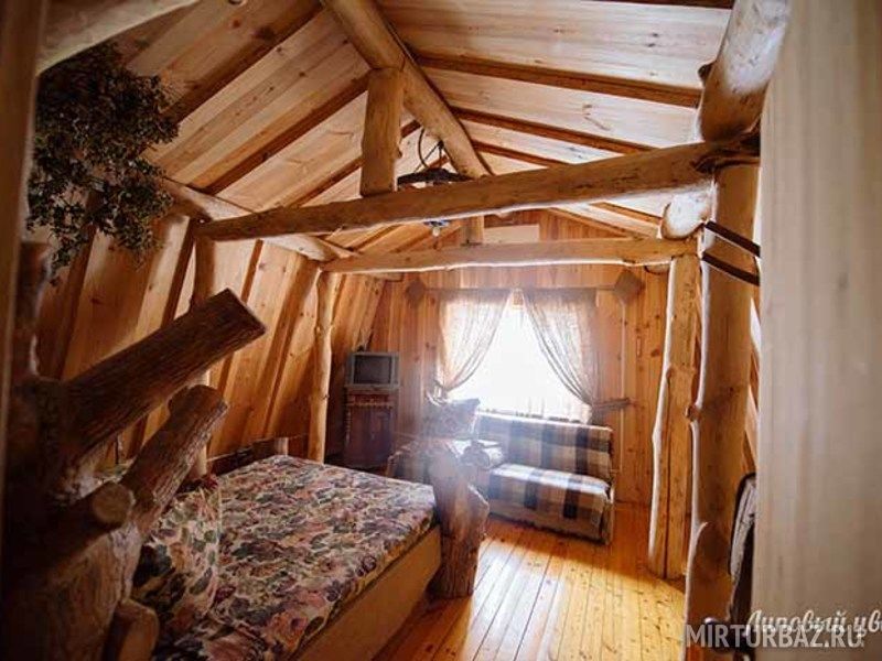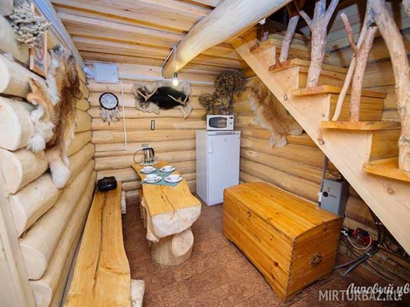 Деревянный дом №4 на 4 места двухэтажный с баней. Теплые полы, баня, санузел с душевой, горячее и холодное водоснабжение, посуда, микроволновка, холодильник, обеденный стол, в спальне на втором этаже двуспальная кровать с постельным бельем, диван и кондиционер.