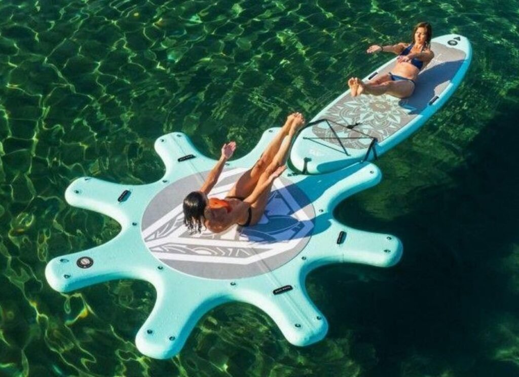 Надувная стыковочная платформа (станция) SUP DOCK позволяет состыковывать вместе до 8 SUP досок. С помощью данной конструкции устраивать коллективные занятия йогой или фитнесом на воде легко и комфортно. В центре может размещаться инструктор, а на SUP-досках располагаться остальные участники — все смогут хорошо видеть спортивные элементы, который показывает учитель. Также можно использовать станцию как самостоятельную доску и заниматься в одиночку.