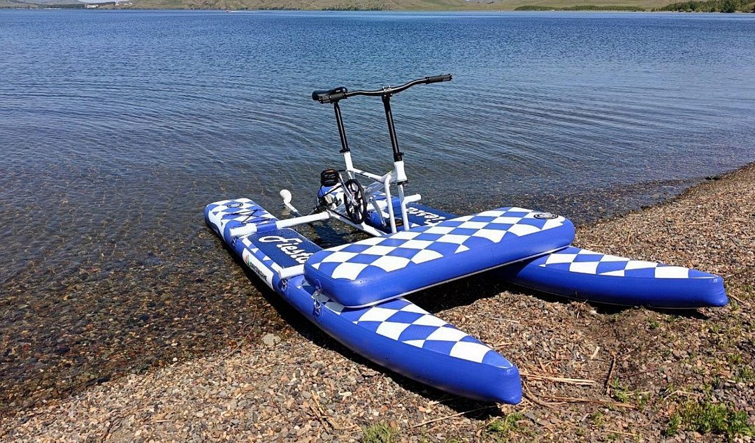 Надувной велосипед-катамаран Fiesta Water Bike-W 10‘6 — необычное плавательное средство с педалями. Этот водный велосипед выполнен на алюминевой раме с двумя надувными буями из ПВХ. Размер каждого буйка — 3203815 см, а требуемое для комфортного использования давление — 15 PSI. Рекомендуется накачивать обе части катамарана до одинакового давления для удобства управления.