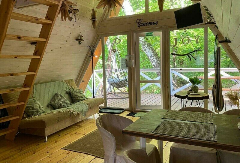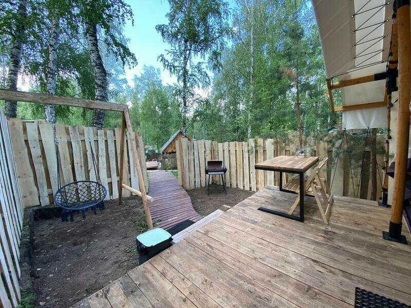 На территории общая лаундж зона с пуфами для взрослых и детей, где можно поиграть в твистер, настольный теннис, пообщаться. Для детей оборудовано игровое пространство в автобусе – детская комната с игрушками, карандашами и альбомами. Во дворе имеется песочница, качели, гамаки и детские батуты. В мини-зоопарке проживают кролики и енот.