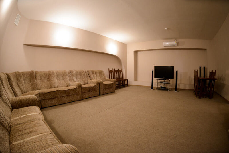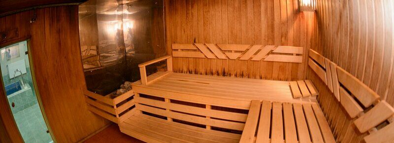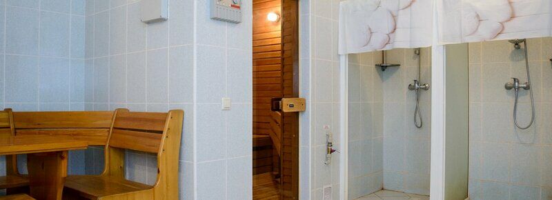 - К вашим услугам уютная сауна, небольшая комната отдыха с деревянной мебелью, телевизором. Финская сауна ("сухой" пар), две душевые кабинки.