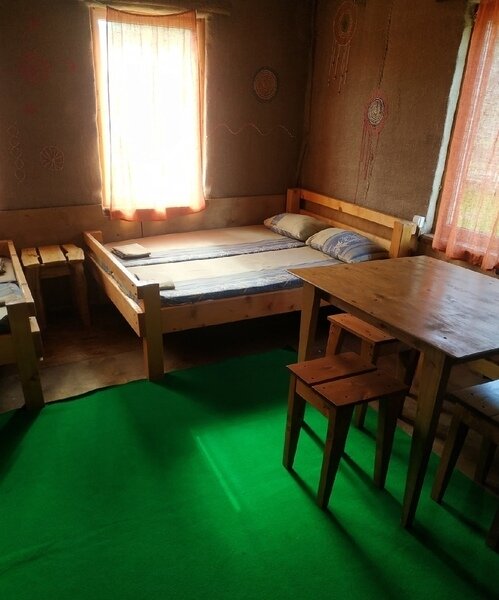 Шестиместный домик деревенского типа. В домике имеется: 4 двуспальные кровати, стол и табуреты, зеркало, рукомойник, печь.