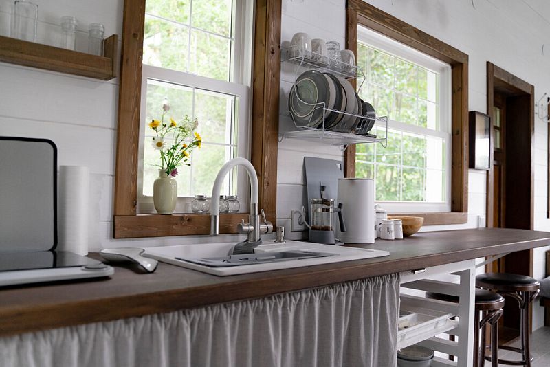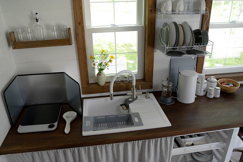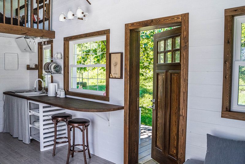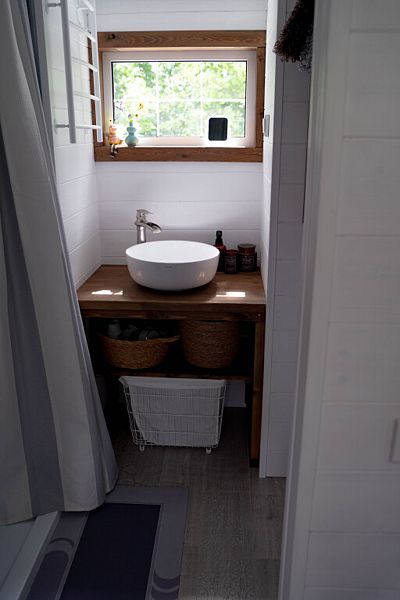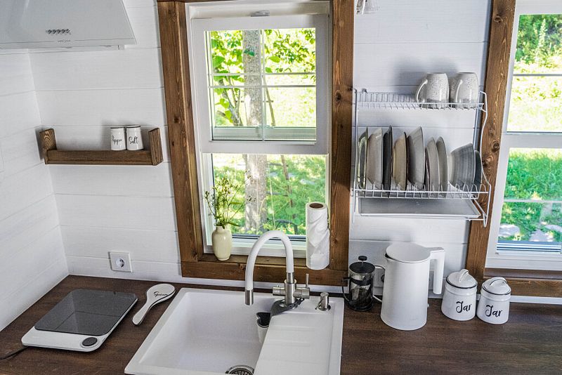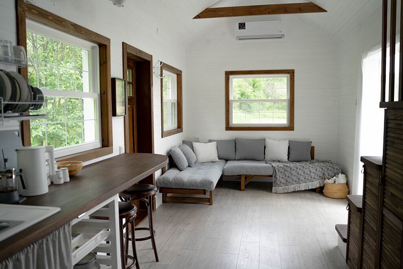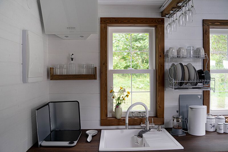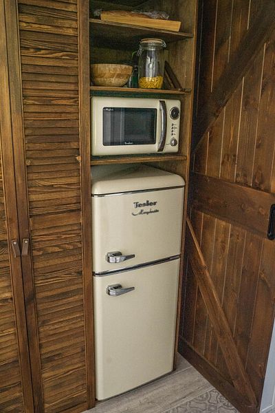 На первом уровне дома находится гостиная с двумя диванами, совмещённая с кухней и обеденной зоной. В кухонной зоне: индукционная варочная панель, холодильник, микроволновая печь, чайник, столовая посуда и приборы, посуда для приготовления еды, средства гигиены, моющие средства, чай, кофе, специи, соль, сахар. На 1-ом этаже дома находятся туалет, душевая.