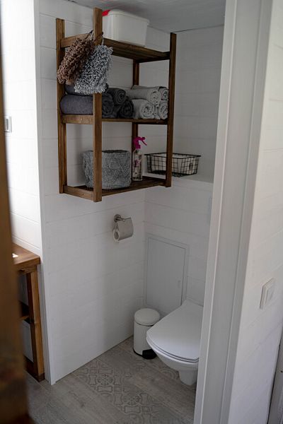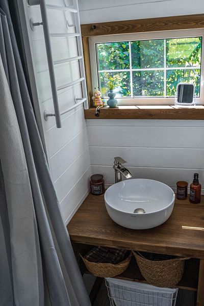 На втором уровне дома расположена спальная зона с видом на реку и высоким ортопедическим матрасом Аскона размером 140х200 см, кондиционером, вентилятором. Гостям доступен полный комплект постельного белья, полотенец.