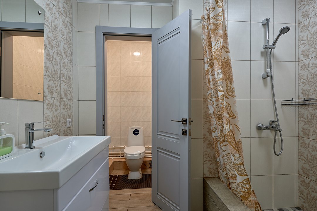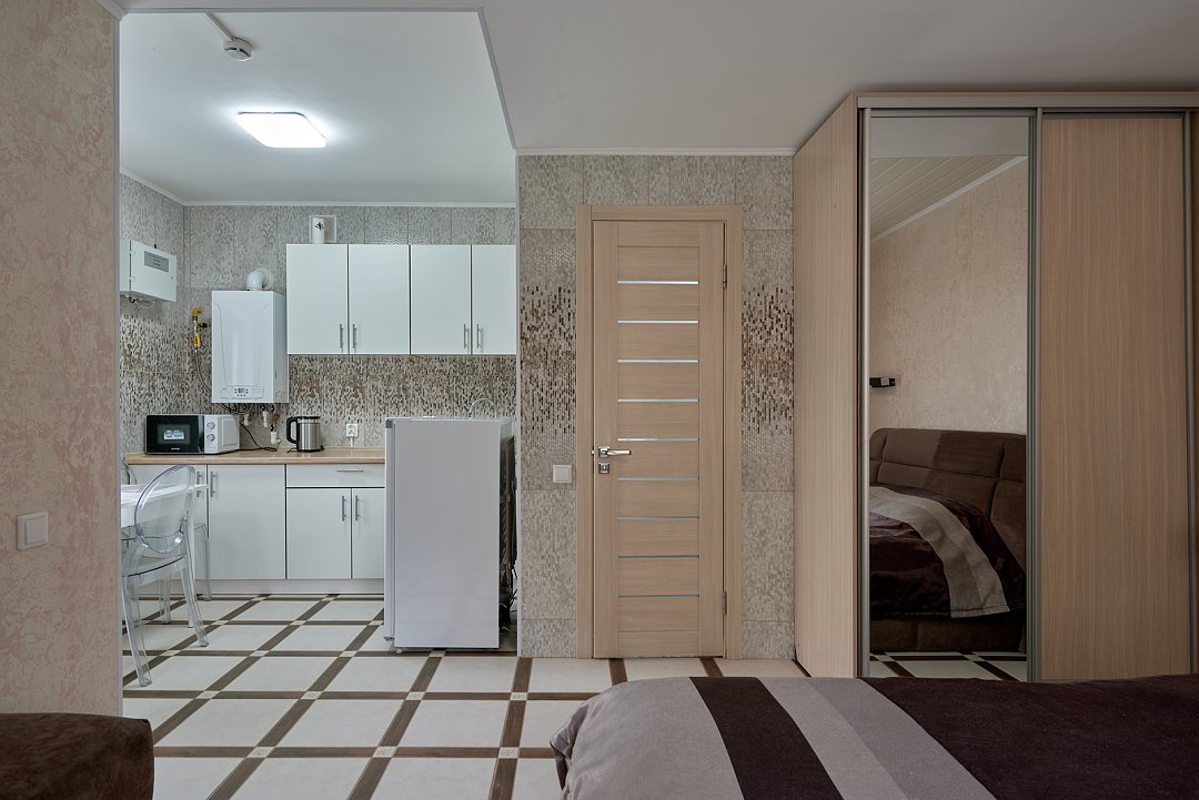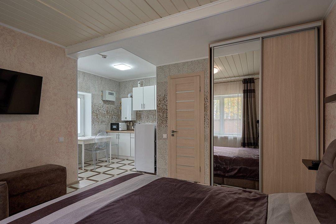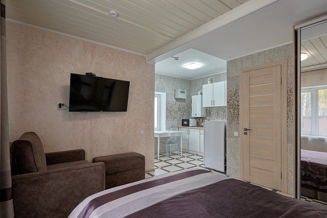 Уютный домик-студия 25 квадратных метров, с новым евро ремонтом подойдёт как для пары, так и для семьи с одним ребёнком. Максимальное размещение с учётом дополнительного места — 3 человека.
