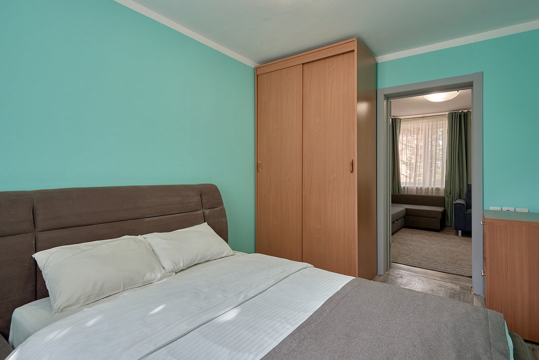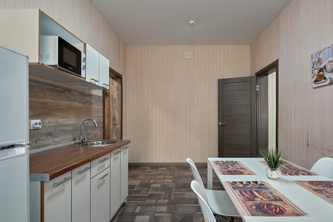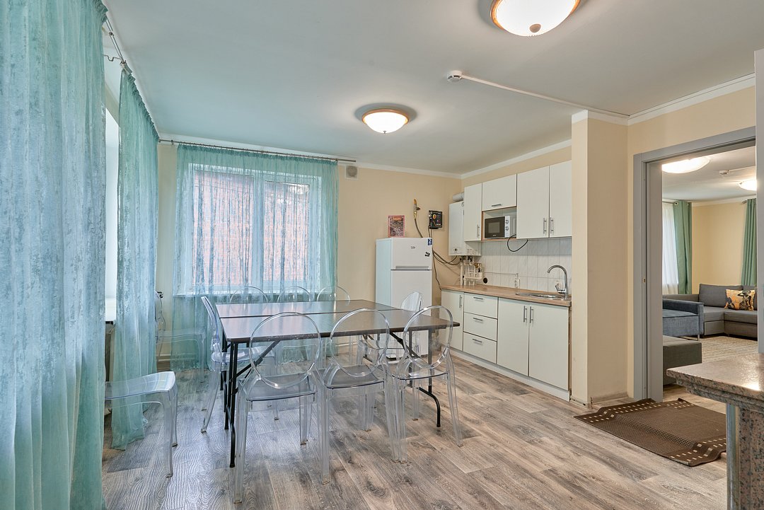 Просторные однокомнатные апартаменты площадью 35 м² отлично подойдут для отдыха семьи или компании друзей. Удобная планировка с отдельной кухонной зоной и спальней позволяет комфортно разместиться до 6 гостей (5 основных мест + 1 дополнительное).