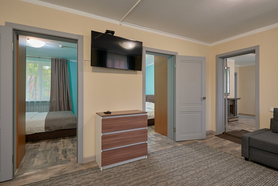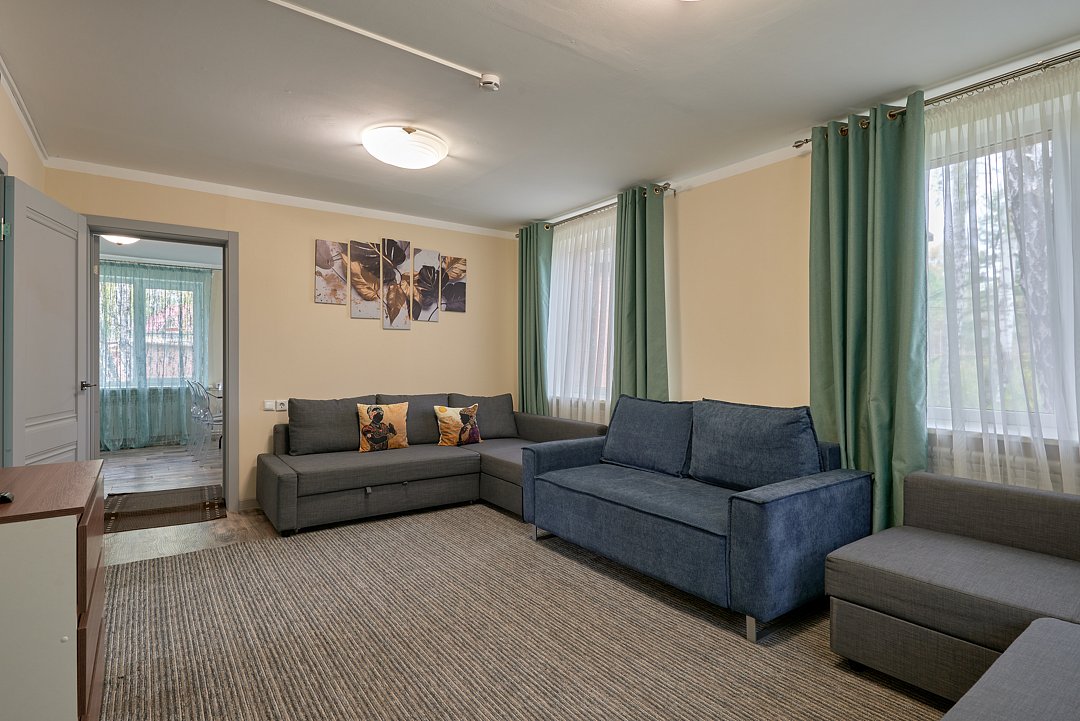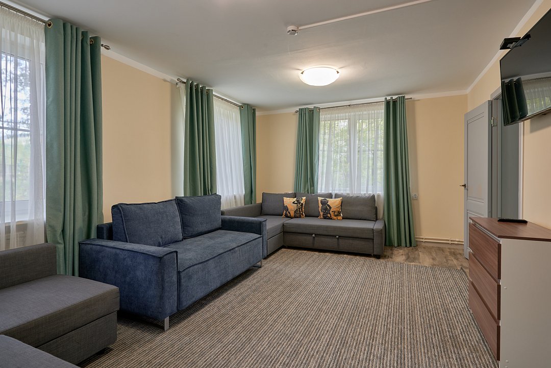 Отдельно стоящий дом вместимость до 10 человек. В номере две спальни с двуспальными кроватями и гостиная с 3 диванами.