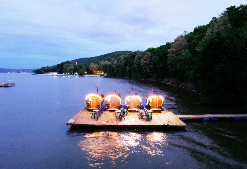 Установлены бани-бочки на воде. После жаркой парной вы можете сразу же окунуться в водохранилище.