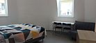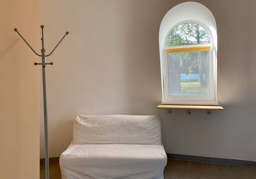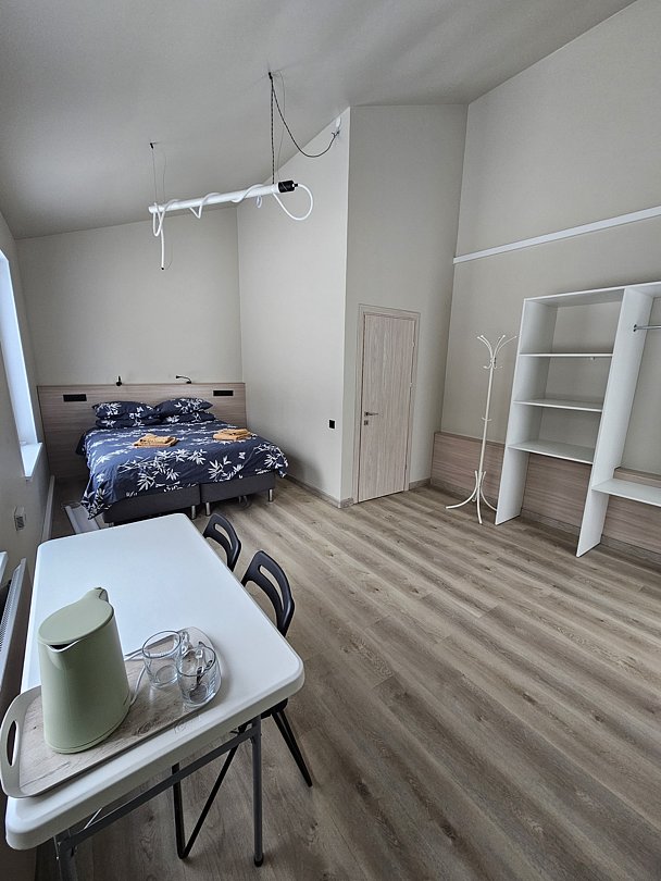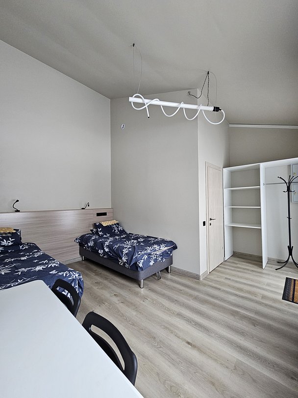 В каждом номере две или три односпальные кровати с ортопедическими матрацами, стулья, вешалки для одежды, тумбы/полки для хранения вещей.